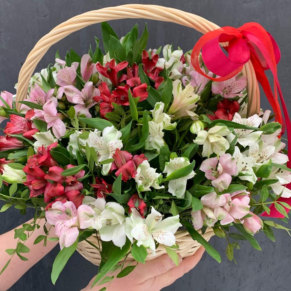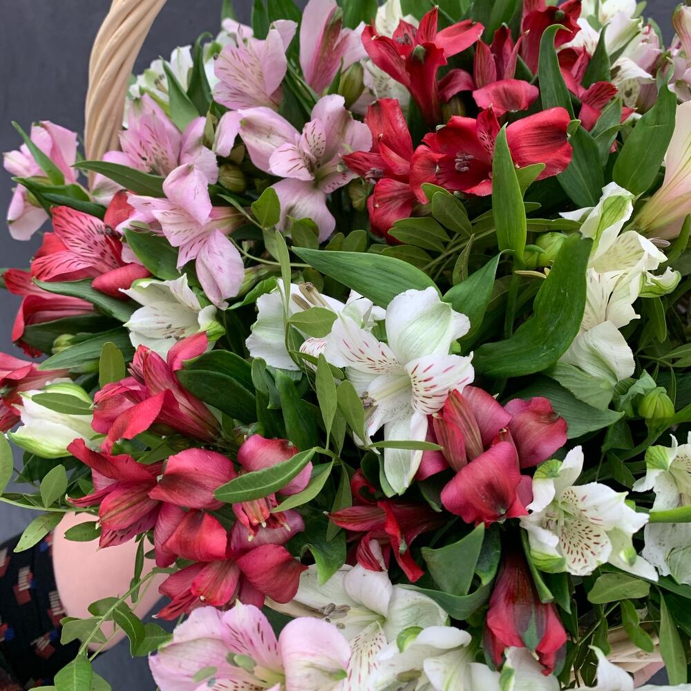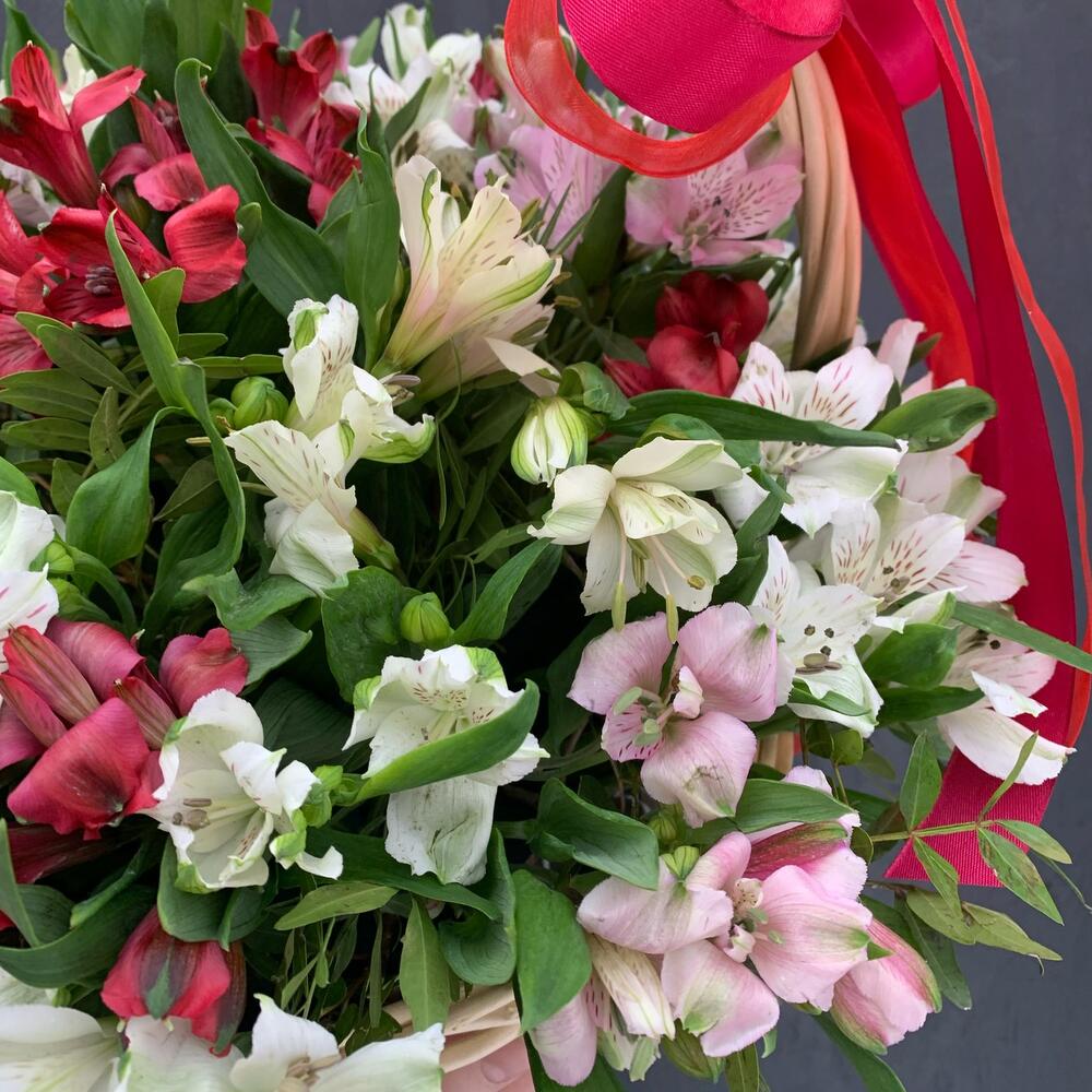 Альстромерия – 21 шт.Оазис – 1 шт.Фисташка – 10 шт.Корзина плетеная – 1 шт.