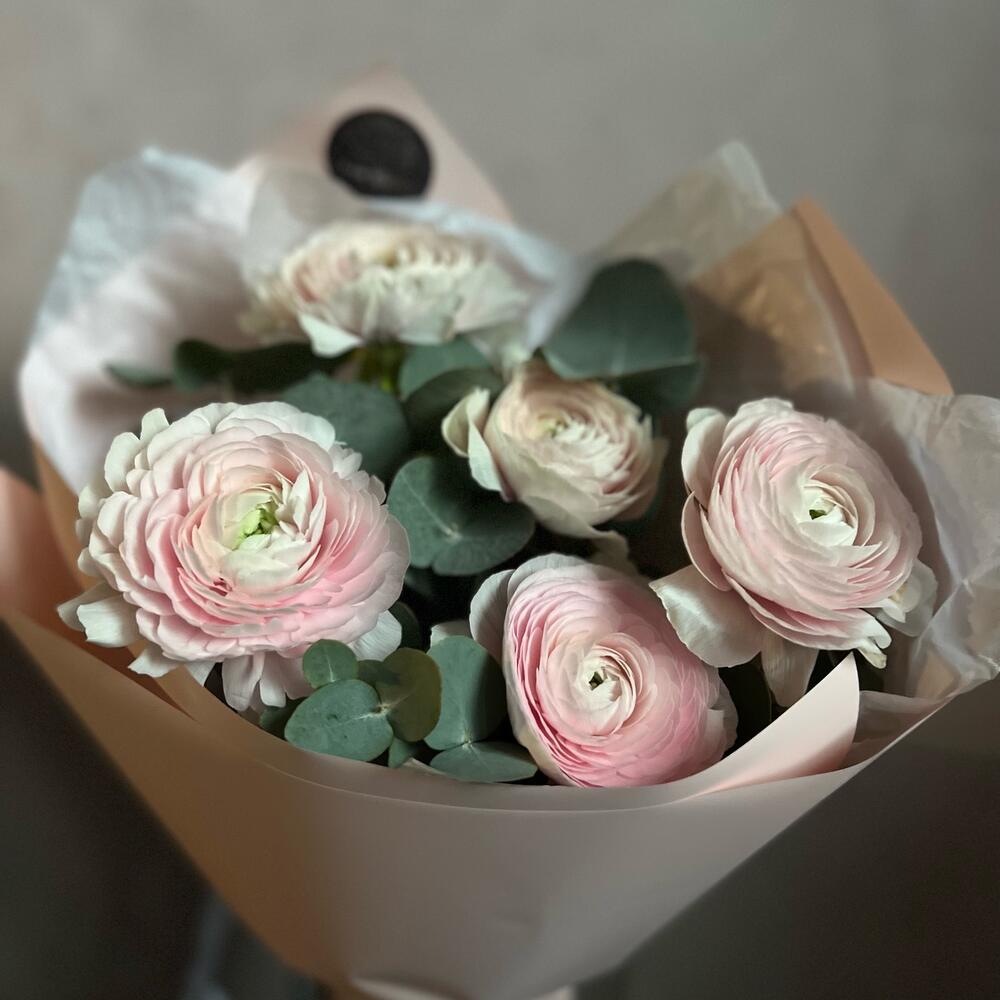 Ранункулюс – 5 шт.Эвкалипт – 5 шт.декоративная упаковка – 1 шт.Атласная лента – 1 шт.