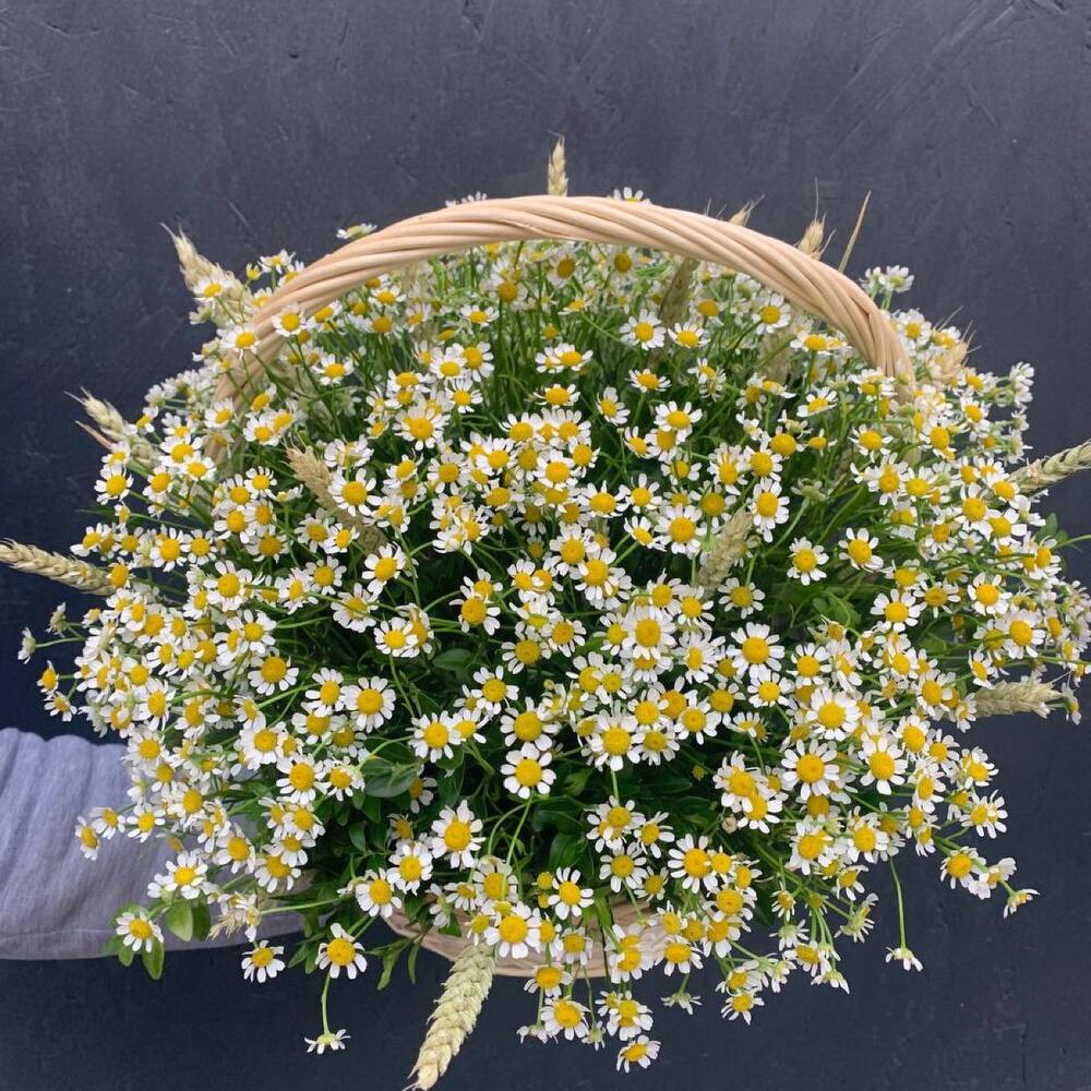 Корзина из ромашки (матрекарии), триникума, зелени «Летнее танго»