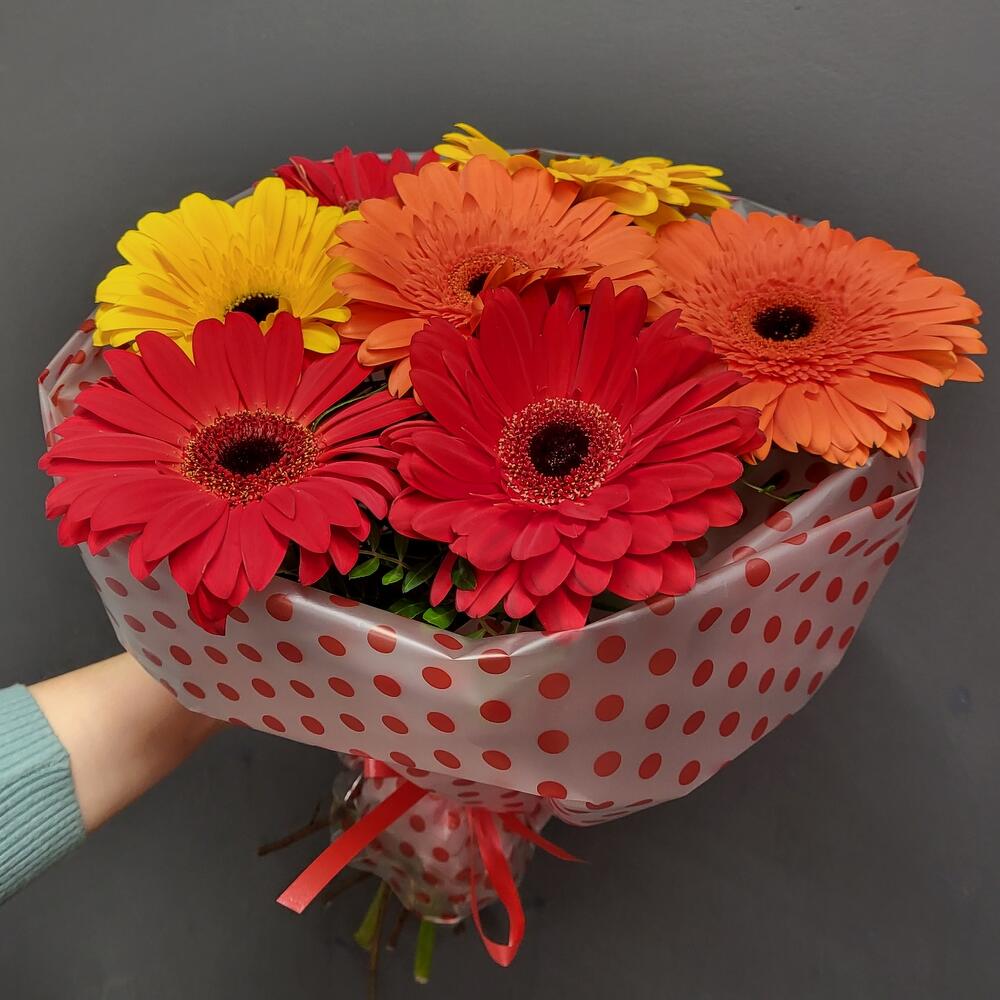 Гербера – 7 шт.зелень декоративная – 1 шт.Упаковка дизайнерская – 1 шт.