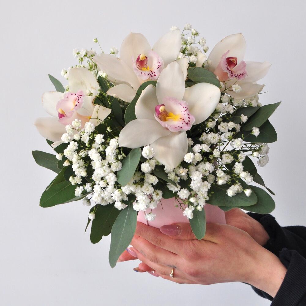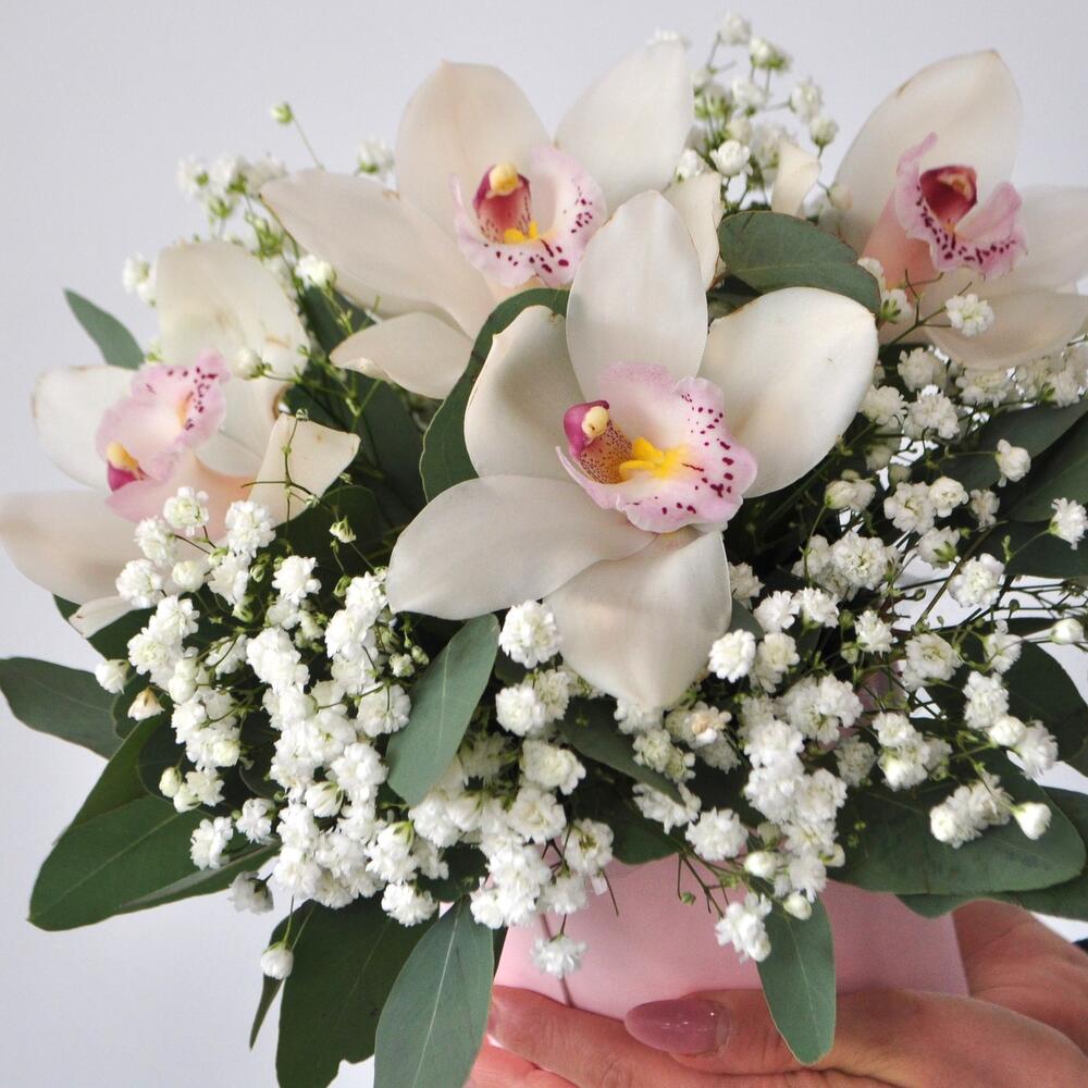 Гипсофила – 1 шт.Орхидея Цимбидиум – 5 шт.Эвкалипт – 1 шт.Коробка – 1 шт.Оазис флористический – 1 шт.