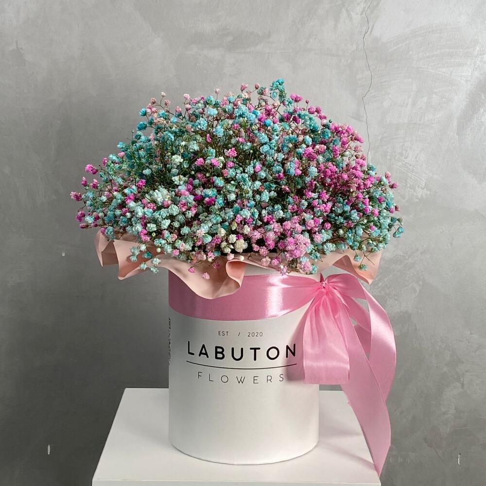 “Сиреневый туман” – композиция из гипсофилы в шляпной коробке