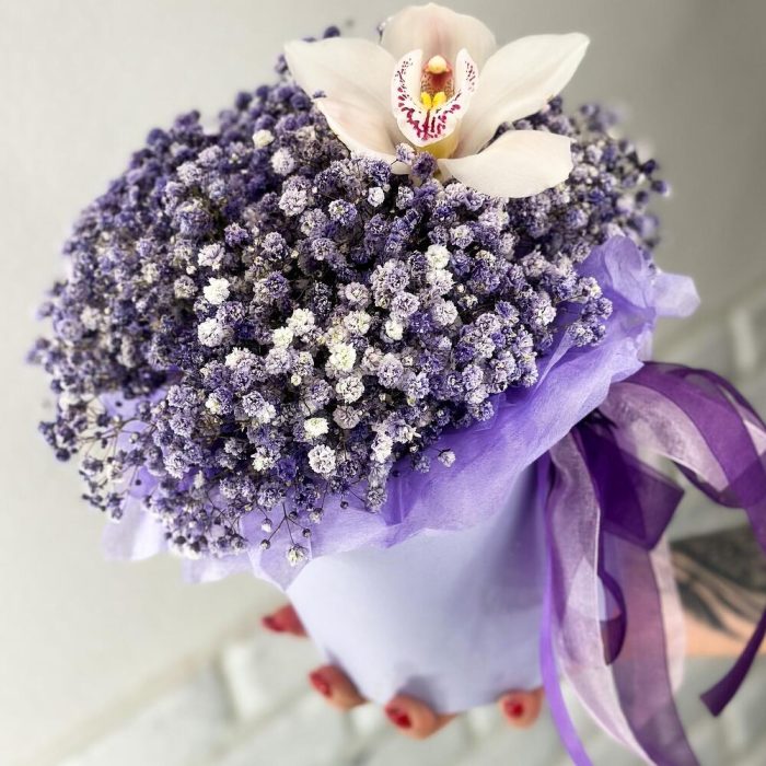 Гипсофила – 7 шт.Орхидея Цимбидиум – 1 шт.Средство для продления жизни цветов – 1 шт.инструкция по уходу за цветами – 1 шт.шляпная коробка с лентами и оазисом – 1 шт.