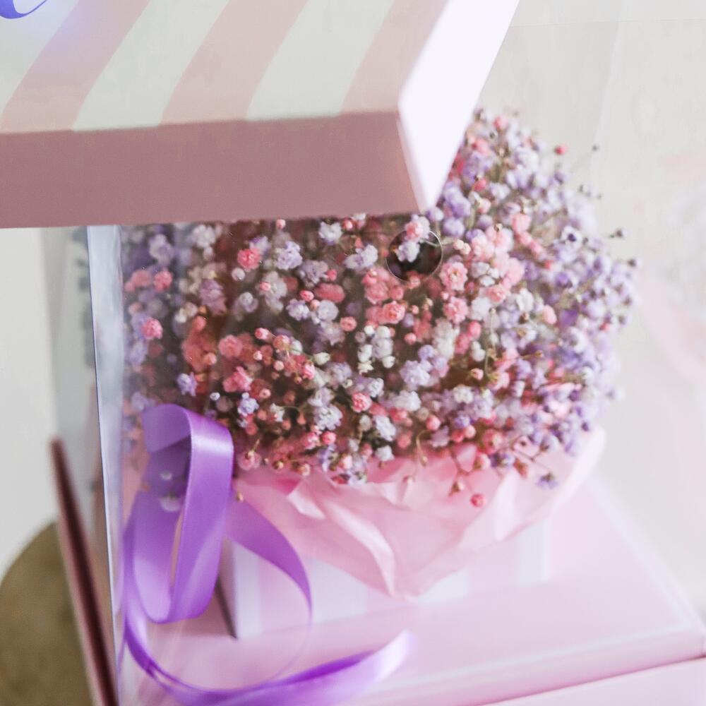 Гипсофила – 5 шт.Оазис флористический – 1 шт.Лента атласная – 2 шт.транспортировочная упаковка – 1 шт.инструкция по уходу за цветами – 1 шт.