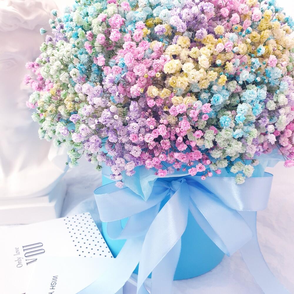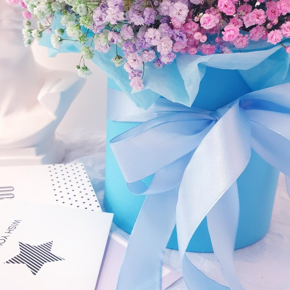 Лента атласная – 1 шт.Коробка шляпная – 1 шт.Открыточка с вашими пожеланиями – 1 шт.Оазис флористический – 1 шт.гипсофила радужная – 7 шт.