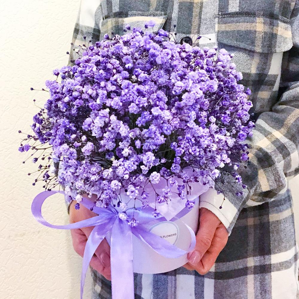 гипсофила цветная – 5 шт.Коробка шляпная – 1 шт.Лента атласная – 1 шт.Оазис флористический – 1 шт.Тишью – 4 шт.Упаковка транспортировочная пленка – 1 шт.инструкция по уходу за цветами – 1 шт.