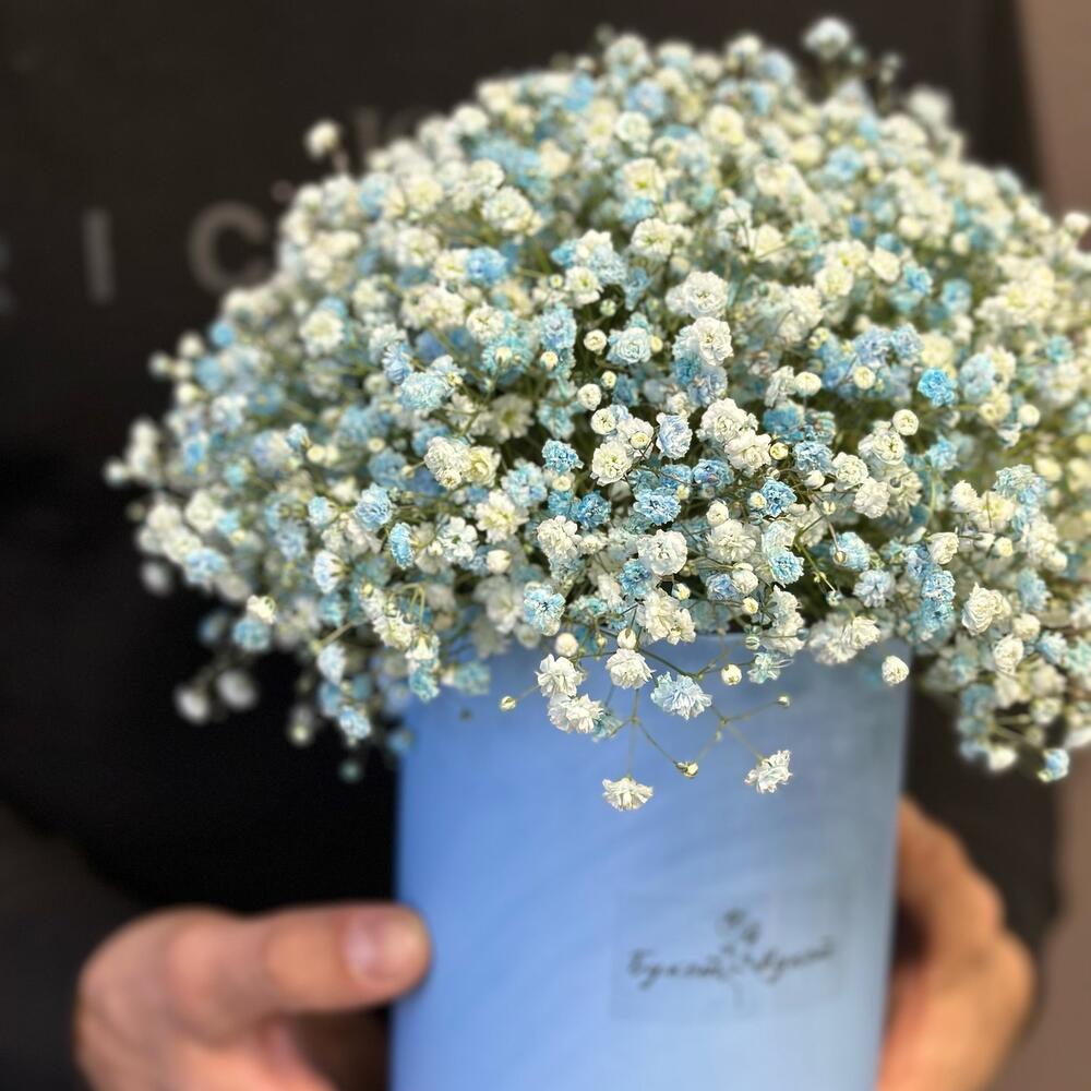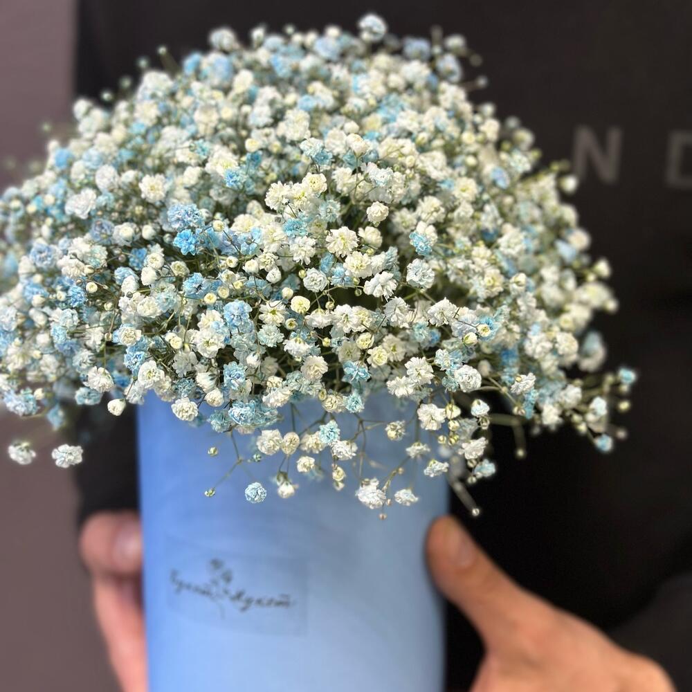 “Сиреневый туман” – композиция из гипсофилы в шляпной коробке