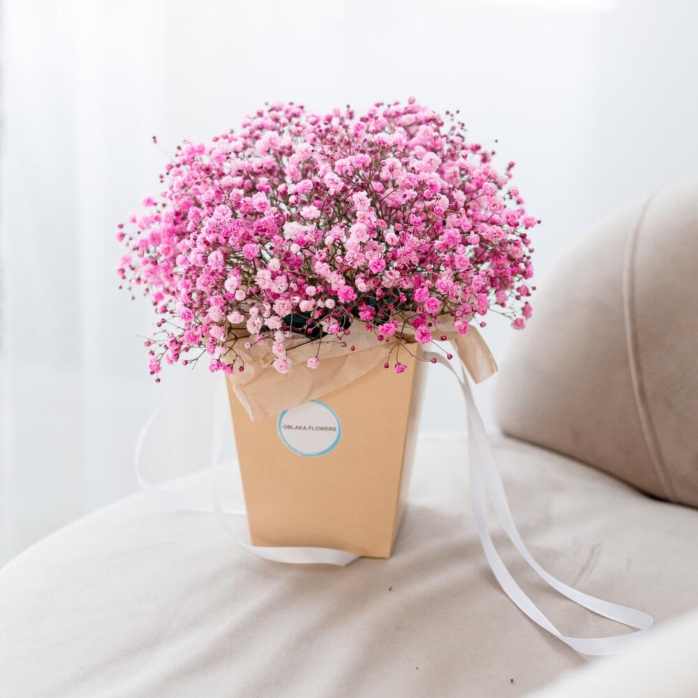 гипсофила цветная – 5 шт.Губка флористическая – 1 шт.Лента атласная – 2 шт.Сумочка картонная – 1 шт.