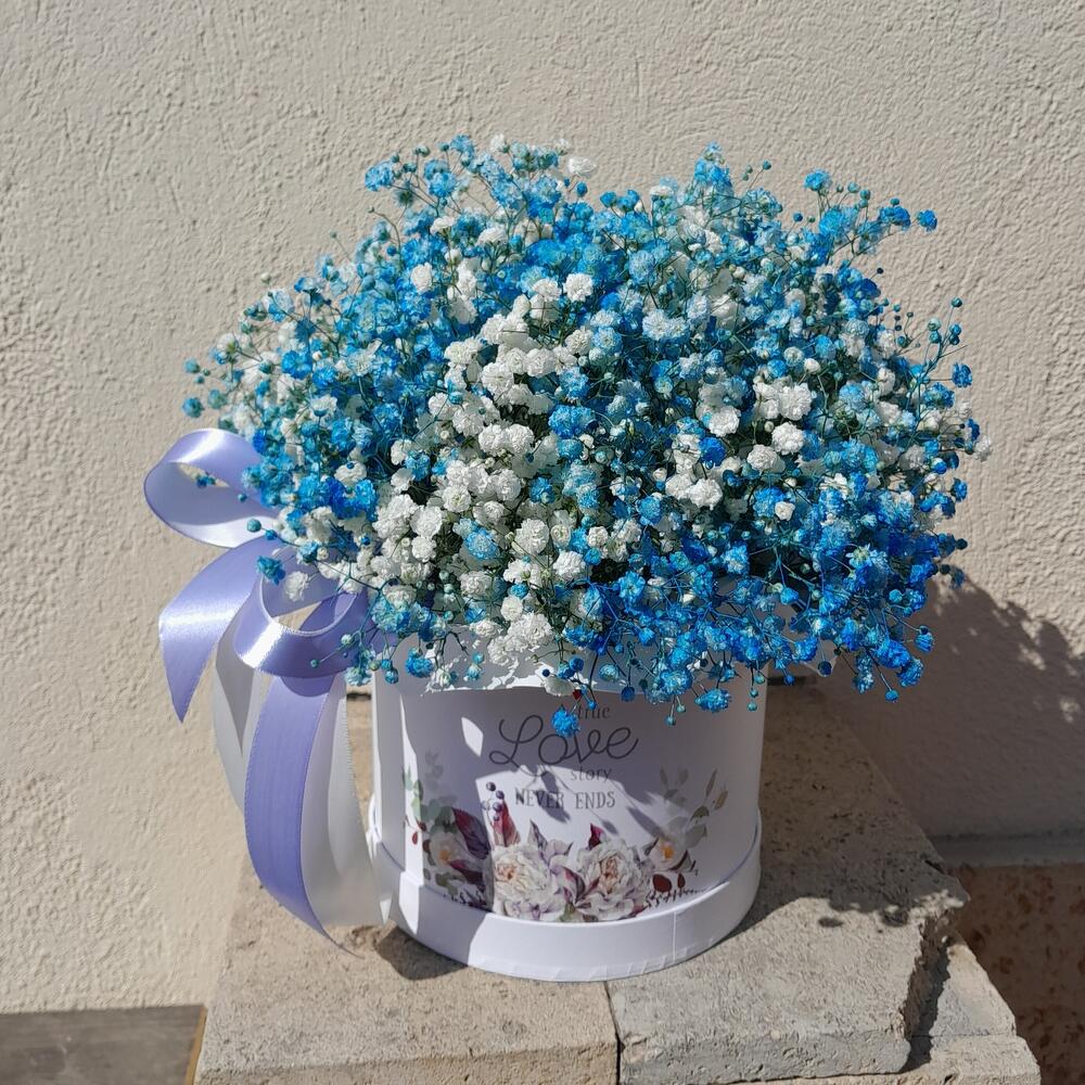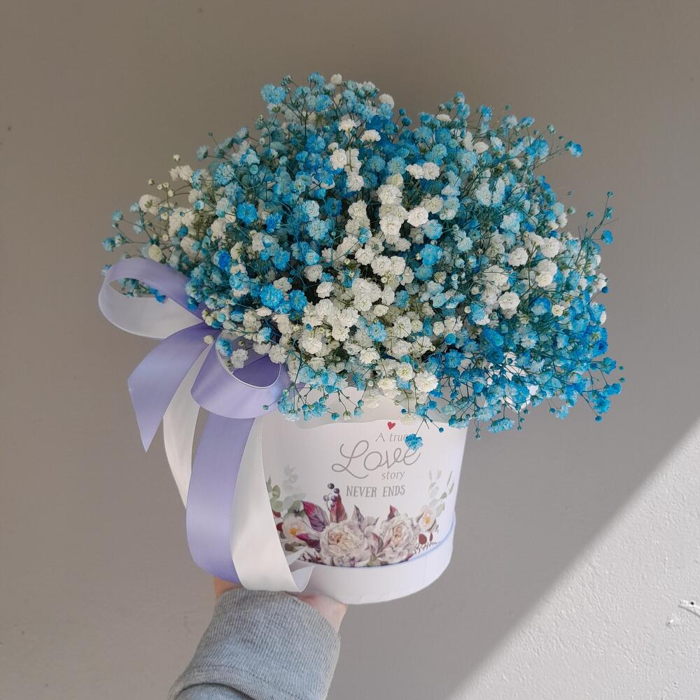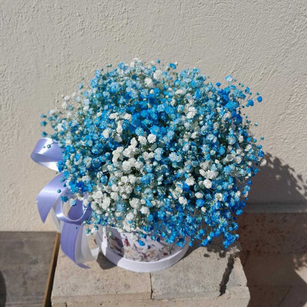 Гипсофила – 9 шт.Лента атласная – 2 шт.Кашпо – 1 шт.Упаковка дизайнерская – 2 шт.Оазис флористический – 1 шт.