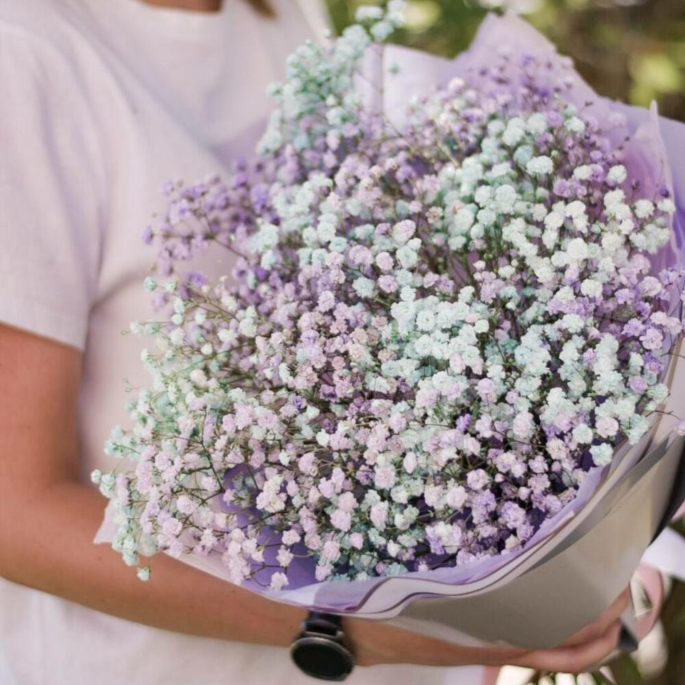 “Сиреневый туман” – композиция из гипсофилы в шляпной коробке