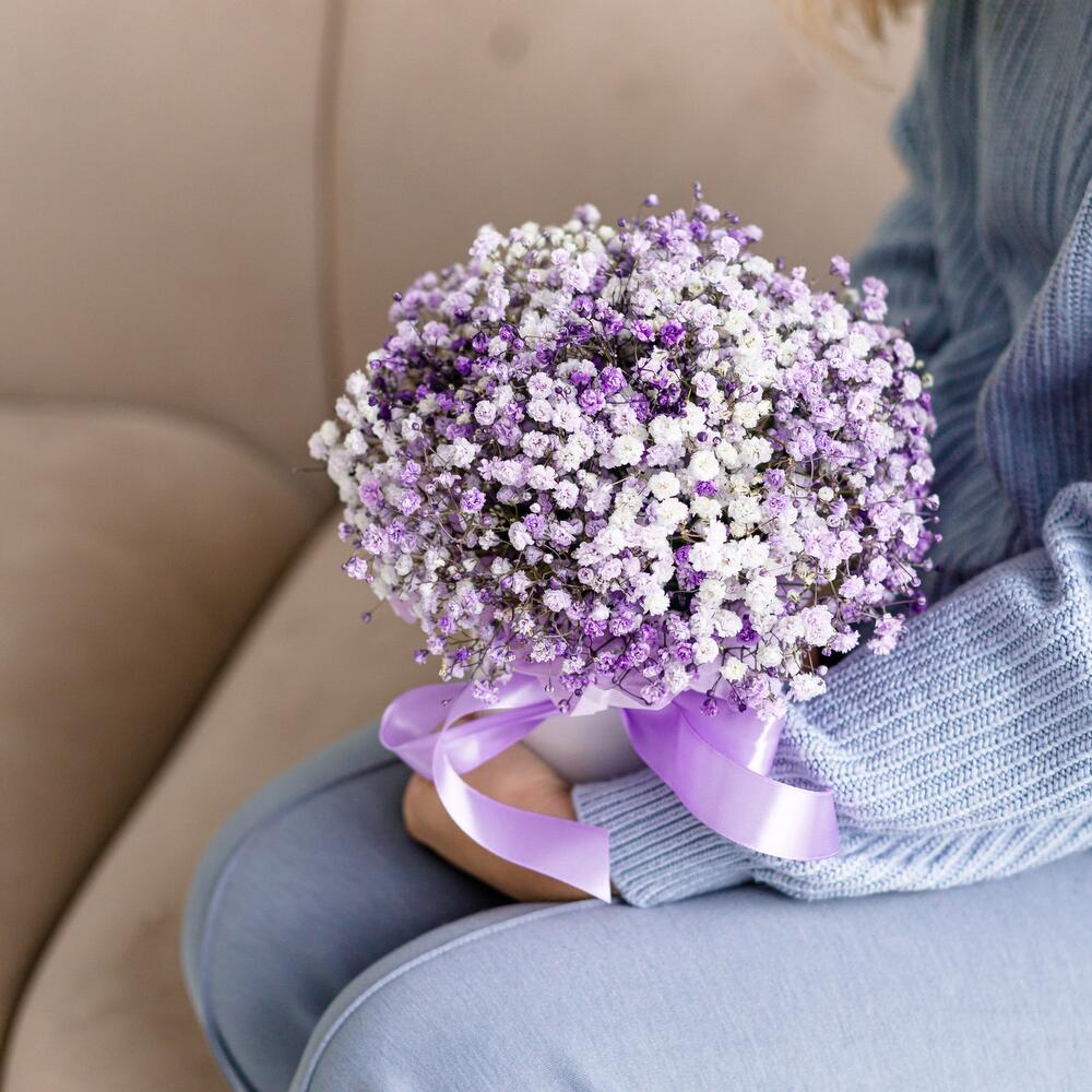 Очаровательная, воздушная композиция из гипсофилы, в шляпной коробке.Цветы стоят в специальной флористической губке,что позволяет им больше оставаться свежими и радовать получателя. Так же композиция в коробке это очень удобно и эффектно, так как не надо ставить букет в вазу и менять воду. Необходимо лишь подливать в губку воду.Инструкция по уходу за цветами прикреплена к каждому заказу.Цветы гипсофилы отличаются стойкостью и даже при высыхании не теряют, декоративности и цвета. Что позволяет, долгое время украшать интерьер в качестве сухоцветов.Подпишем открытку с вашими пожеланиями бесплатно