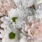 Лента атласная – 1 шт.Диантус – 4 шт.Хризантема кустовая ромашковая белая – 3 шт.упаковка флористическая – 1 шт.
