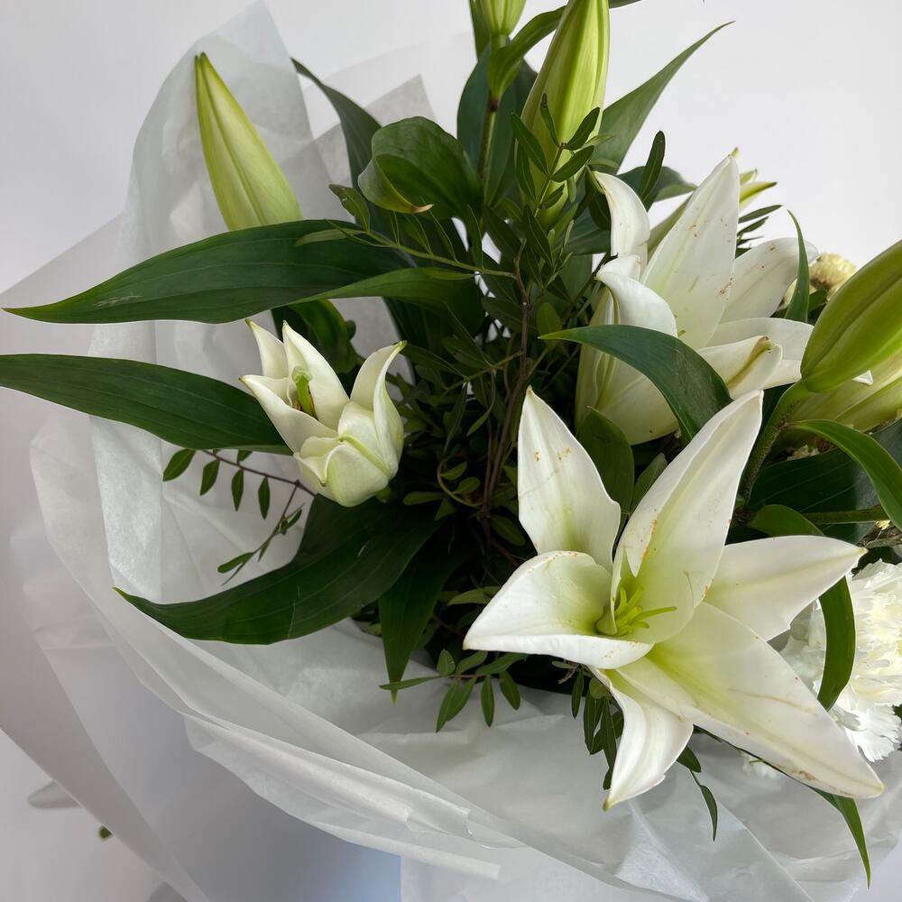 Лилия – 3 шт.Статица – 1 шт.Лента атласная – 2 шт.Диантус – 3 шт.Сантини – 1 шт.Фисташка – 5 шт.Пленка матовая – 6 шт.