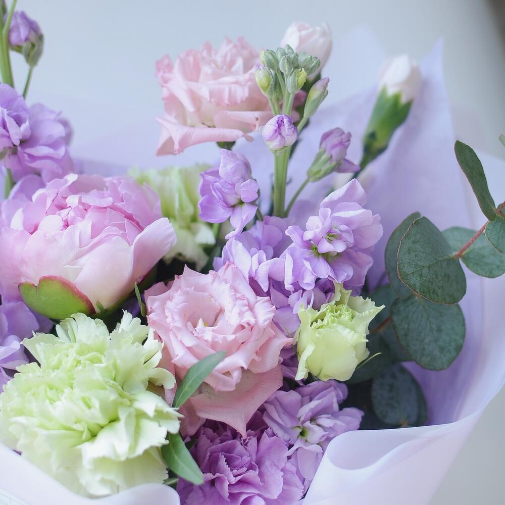 Маттиола – 3 шт.Пион – 1 шт.Эвкалипт – 1 шт.Упаковка дизайнерская – 1 шт.диантус сортовой микс – 3 шт.зелень техническая пучок – 1 шт.эустома alissa pink – 1 шт.динтус кустовой – 1 шт.