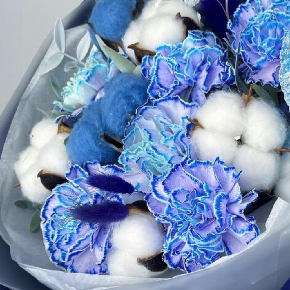 Гвоздика – 7 шт.Хлопок натуральный – 8 шт.Лагурус (сухоцвет) – 7 шт.Лотос (коробочка) – 1 шт.Тишью – 2 шт.Пленка матовая – 2 шт.