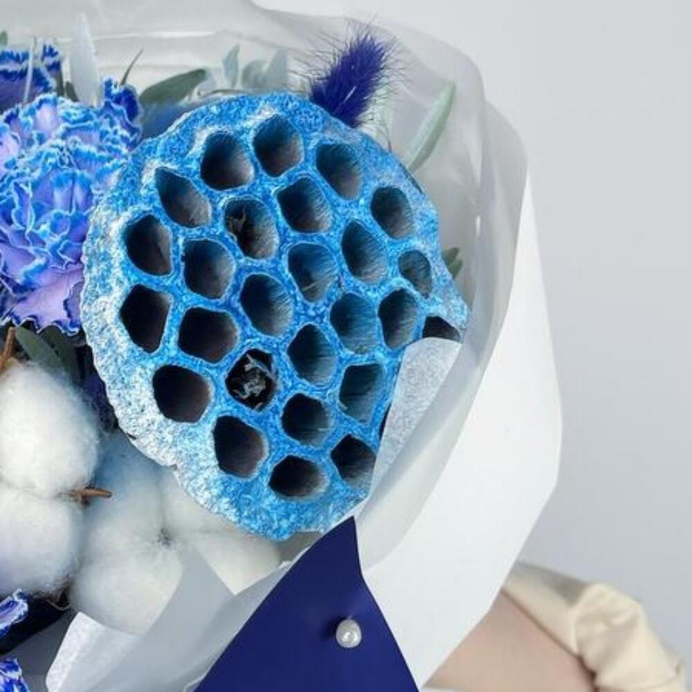 Букет с синими диантусами и лотосом