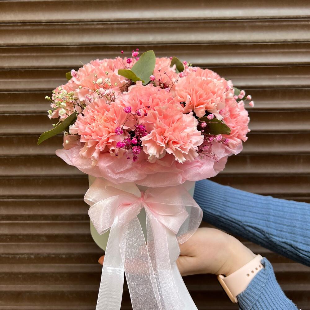 Эвкалипт – 5 шт.Оазис флористический – 1 шт.Диантус сортовой – 13 шт.Гипсофила розовая – 1 шт.коробка шляпная s – 1 шт.