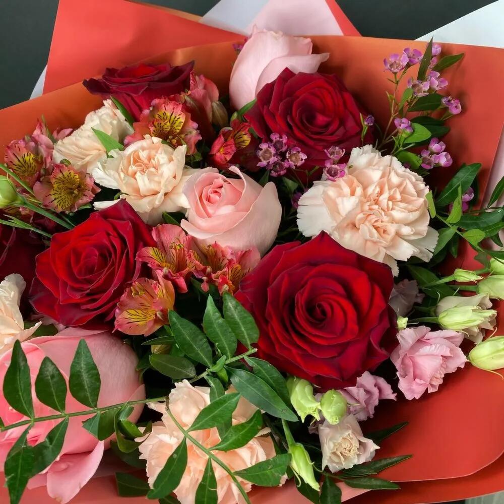 Категории: АльстромерииРозы, Гвоздики, Лизиантусы