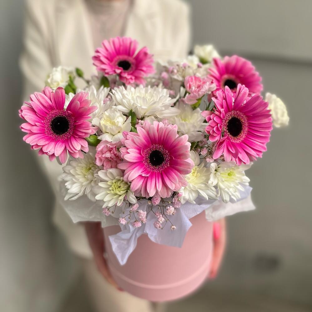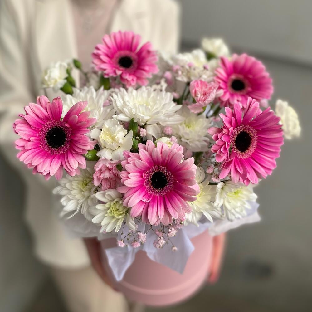 Гермини – 5 шт.Хризантема кустовая – 3 шт.Коробка шляпная – 1 шт.Диантус кустовой – 6 шт.Оазис флористический – 1 шт.