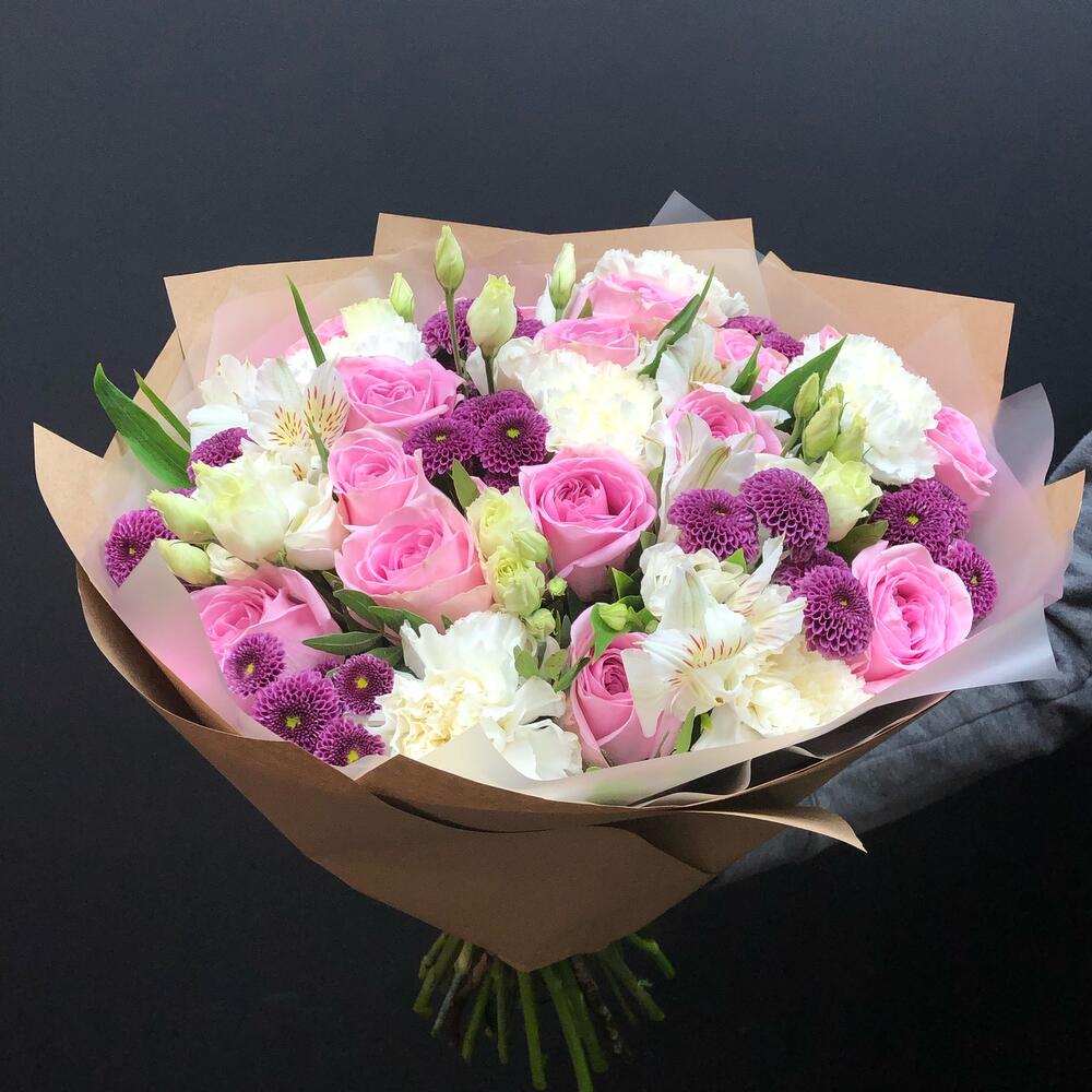 Гвоздики, Лизиантусы, Розы, Тюльпаны