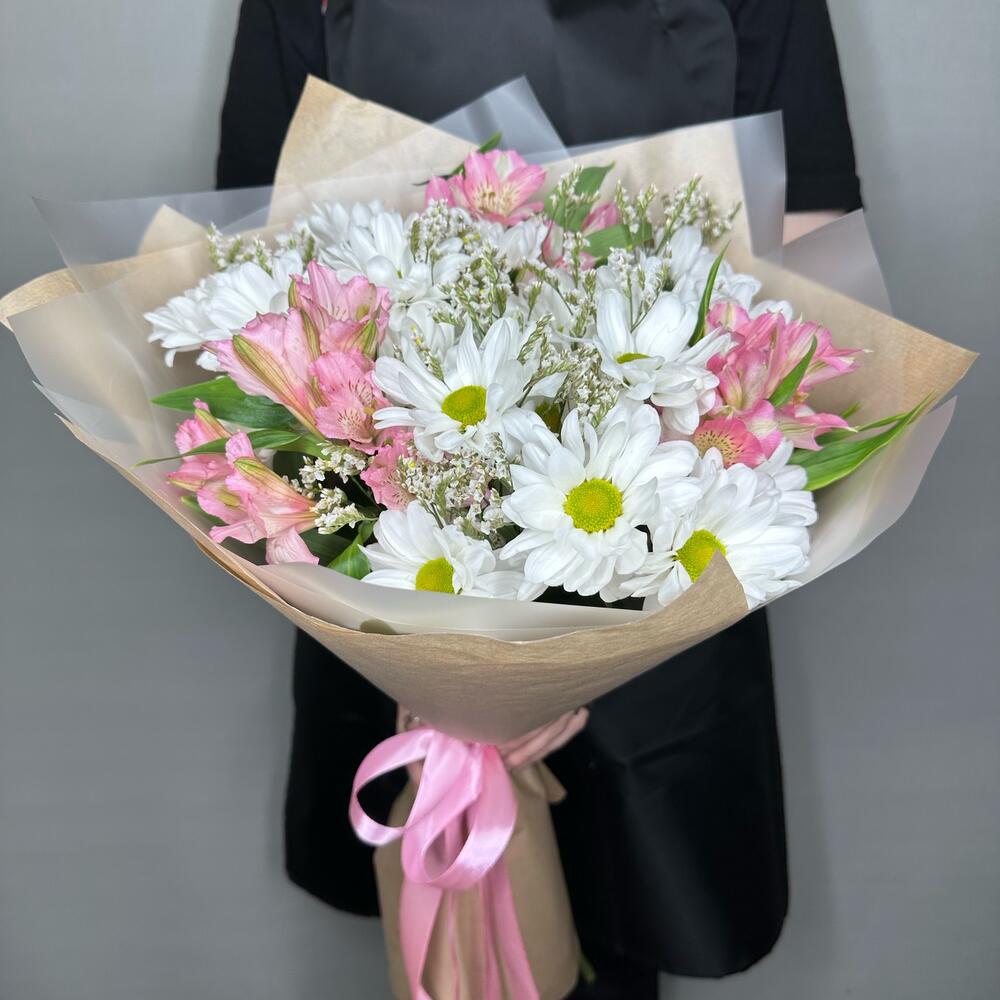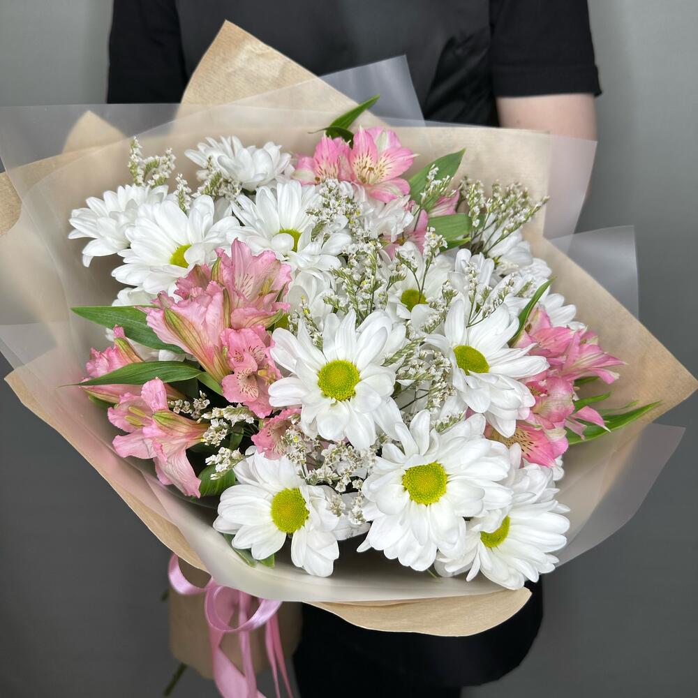 Хризантема кустовая ромашковая – 4 шт.Альстромерия – 3 шт.Лимониум – 1 шт.Упаковка дизайнерская – 1 шт.Лента атласная – 1 шт.