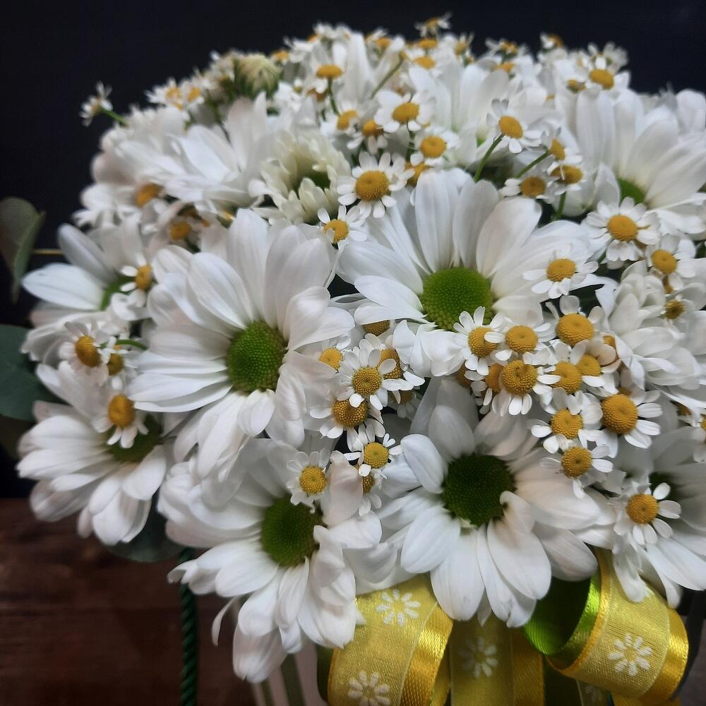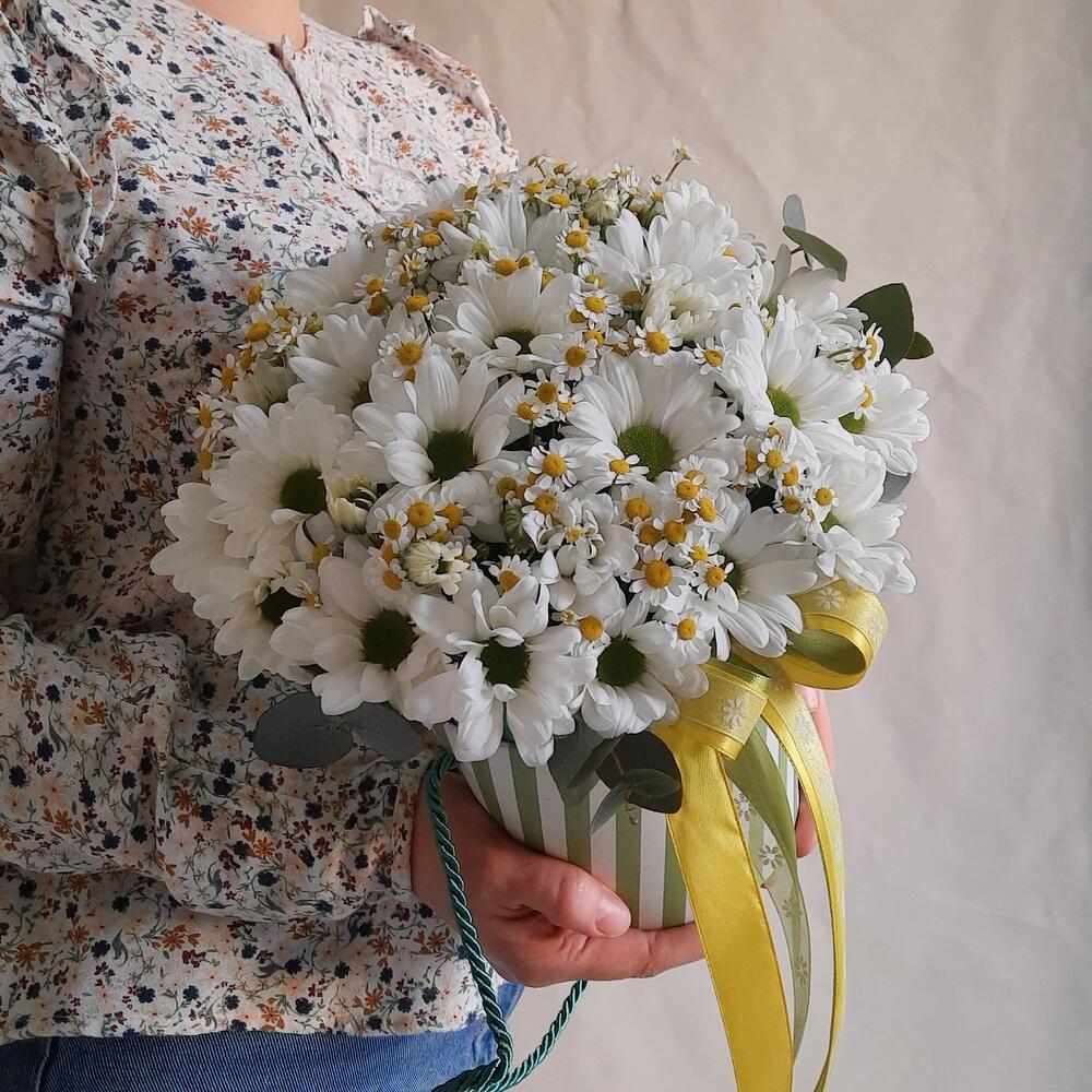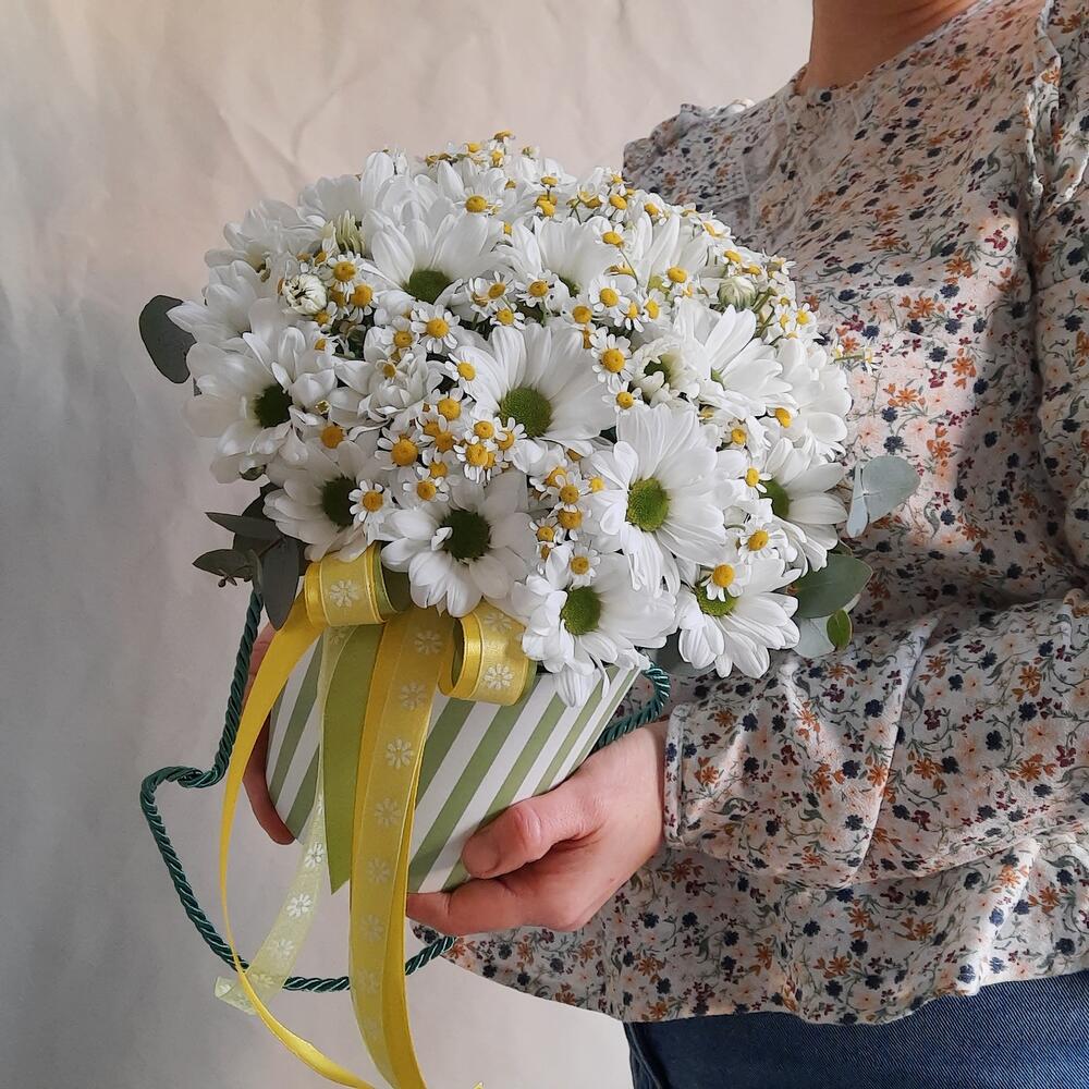 Лента атласная – 3 шт.Коробка шляпная – 1 шт.Оазис – 1 шт.Хризантема кустовая ромашка – 5 шт.Матрикария (ромашка) – 9 шт.фисташка зелень – 2 шт.