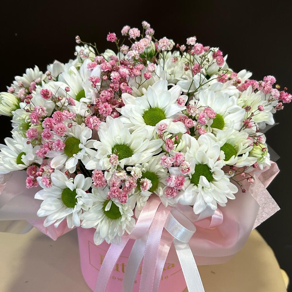 Коробка шляпная – 1 шт.Пиафлор (оазис) – 1 шт.Гипсофила – 3 шт.Хризантема кустовая – 5 шт.