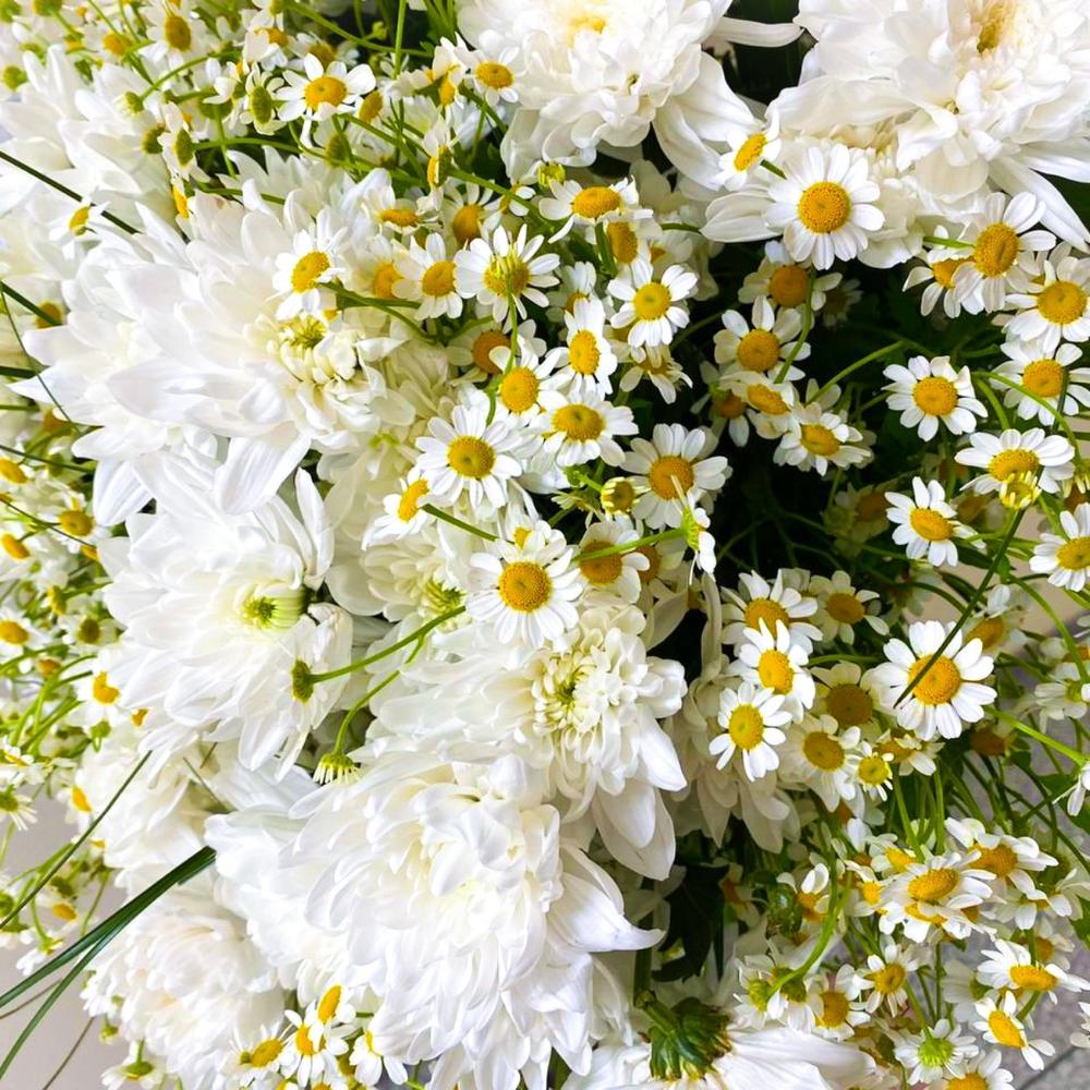 Матрикария – 25 шт.Хризантема кустовая – 5 шт.Лента атласная – 2 шт.