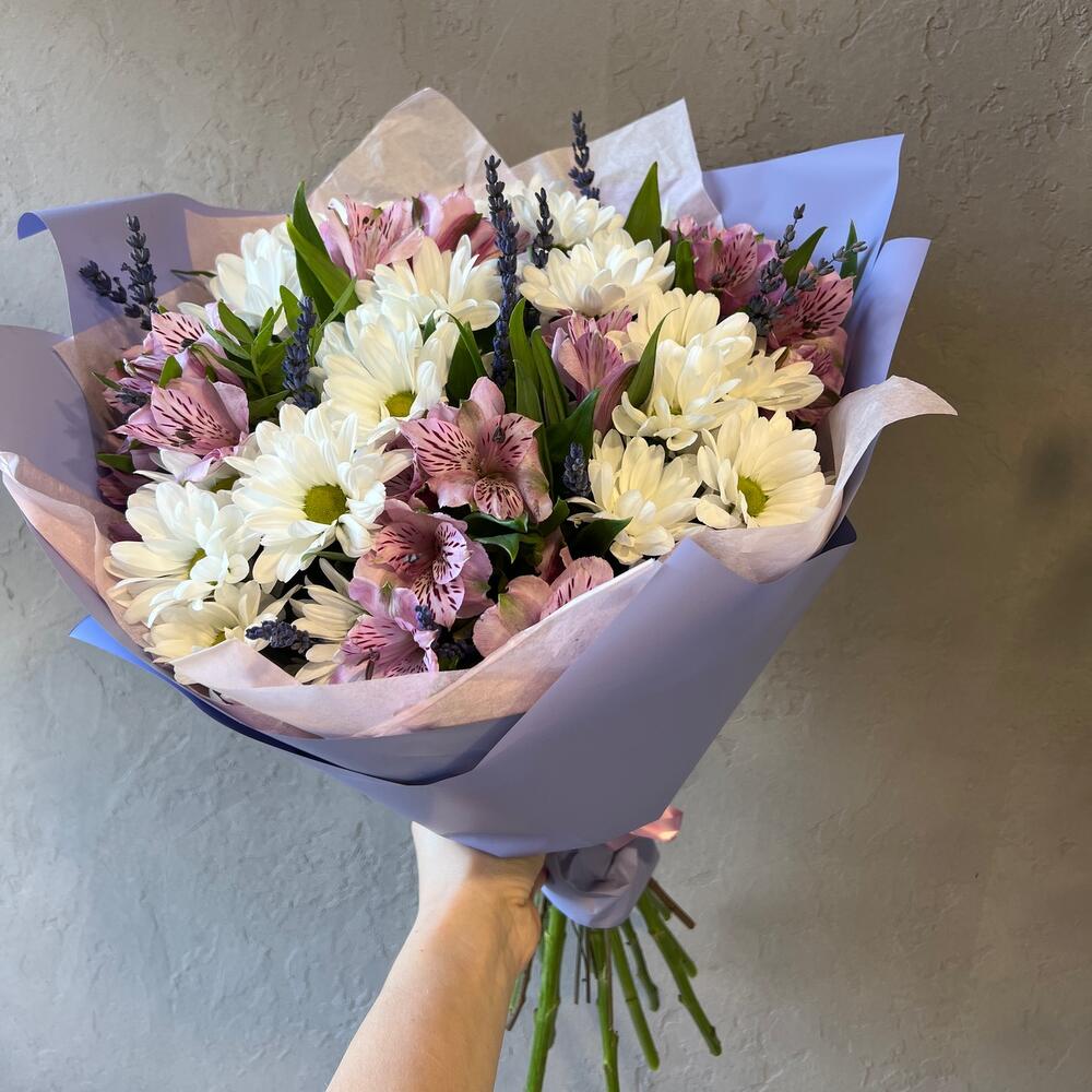 Хризантема кустовая – 6 шт.Альстромерия – 5 шт.лаванда стабилизированная – 15 шт.Фисташка – 2 шт.Упаковка дизайнерская – 1 шт.
