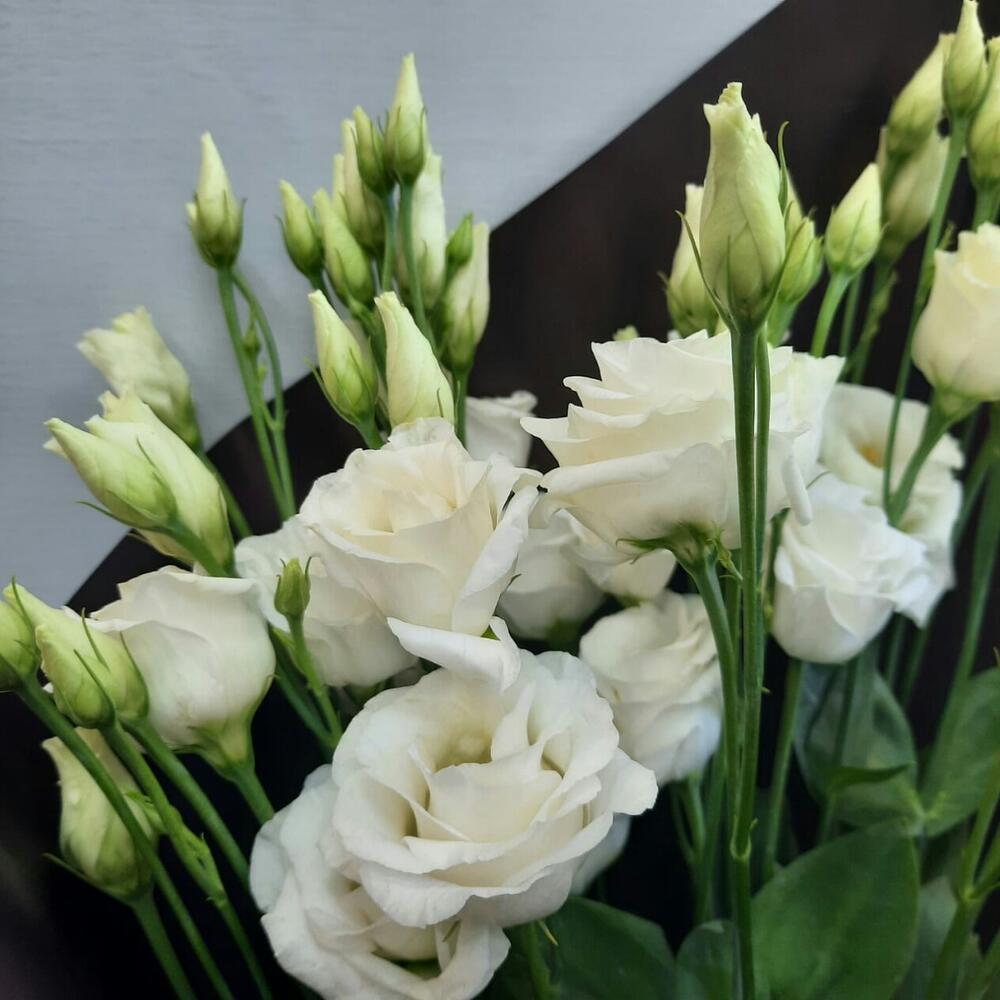 эустома белая – 5 шт.Упаковка дизайнерская – 1 шт.Лента атласная – 1 шт.