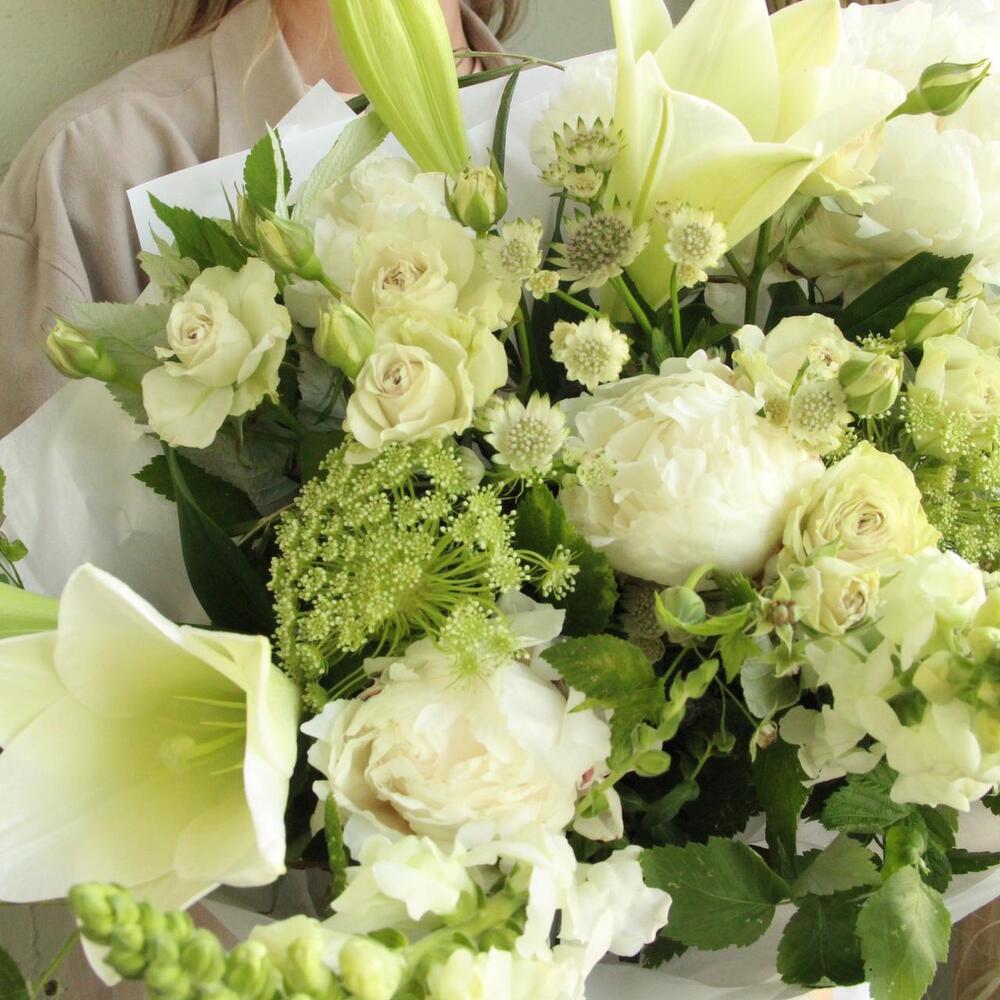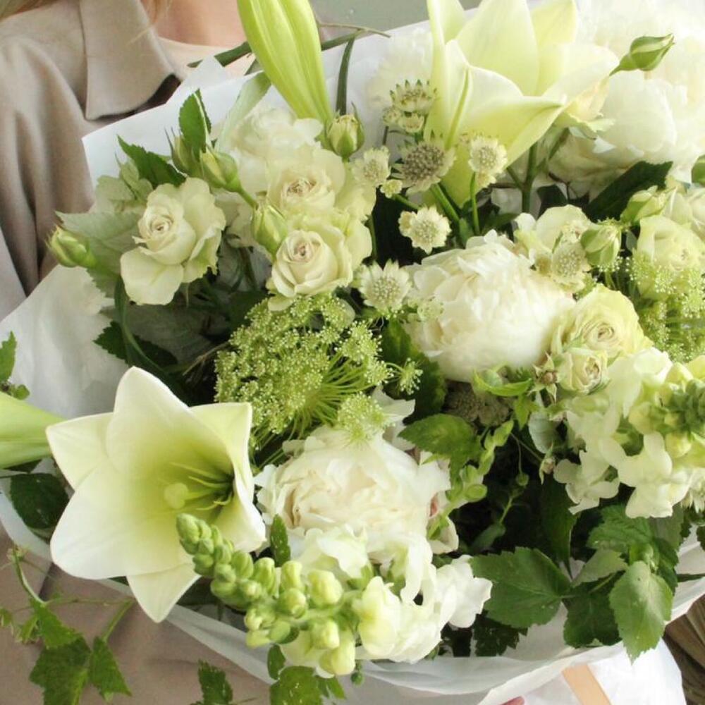 Лилия лонги – 2 шт.Амми – 3 шт.Лизиантус – 3 шт.Львиный зев – 3 шт.Ветки малины – 4 шт.Фисташка – 2 шт.Астранция – 2 шт.Упаковка – 1 шт.Лента атласная – 1 шт.Пион – 3 шт.