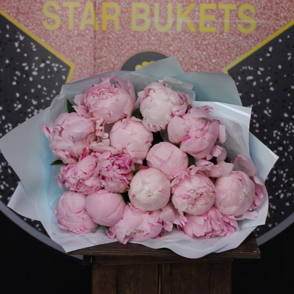 Лента атласная – 1 шт.Тишью – 2 шт.Пион Сара Бернар – 15 шт.Пленка дизайнерская – 3 шт.