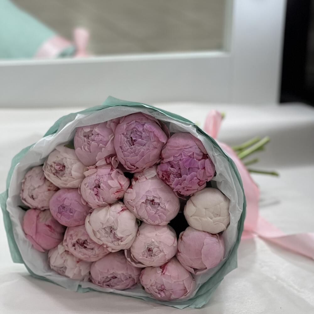 Атласная лента – 1 шт.Пион Сара Бернар – 17 шт.Дизайнерская упаковка – 1 шт.открыточка – 1 шт.