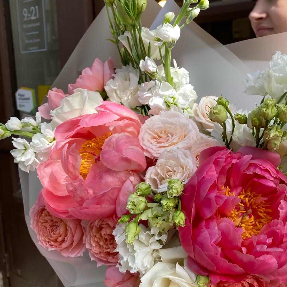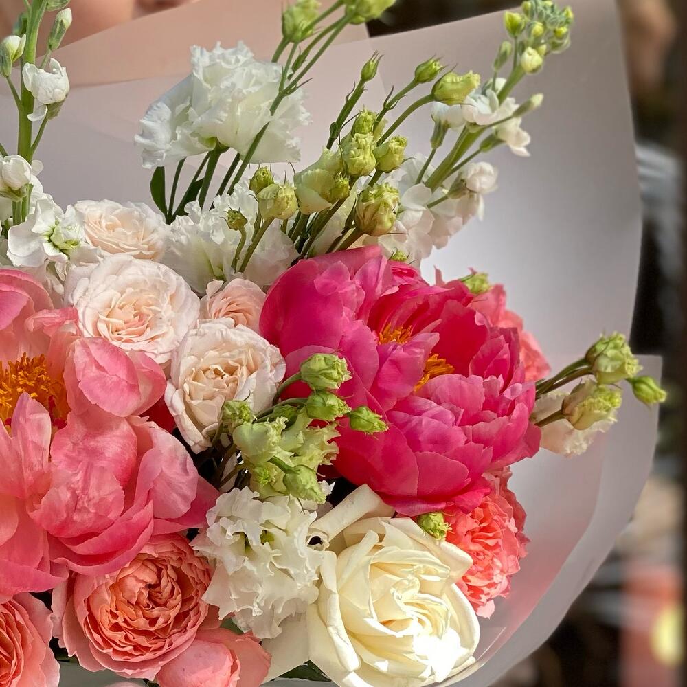 Маттиола – 3 шт.Пион Коралл Шарм (Coral Charm) – 2 шт.Кустовая роза – 1 шт.Эустома – 3 шт.Лента атласная – 1 шт.Упаковка дизайнерская – 3 шт.Кризал (подкормка) – 1 шт.Кустовая роза пионовидная – 3 шт.playa blanca – 2 шт.