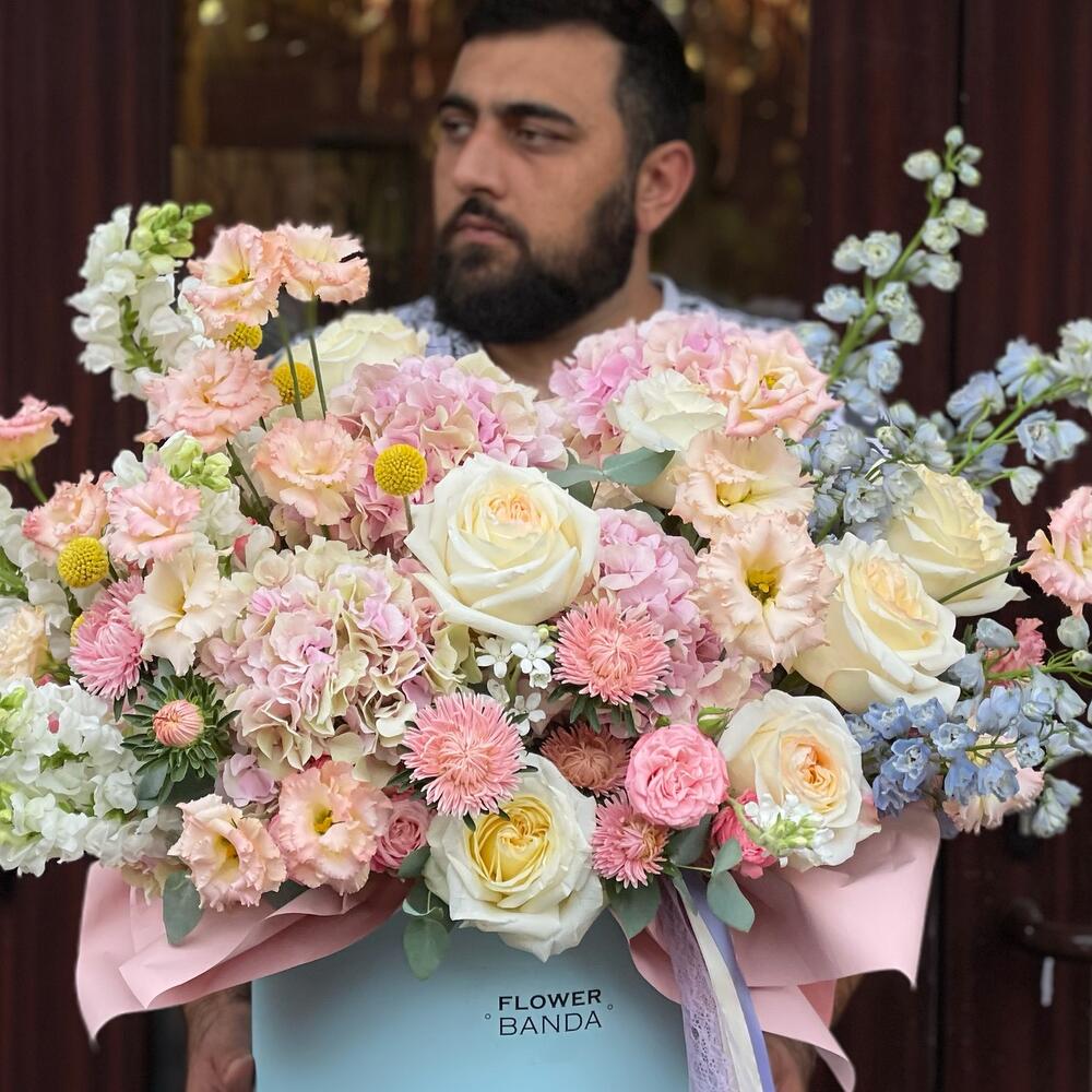 Гортензия розовая – 7 шт.Роза эквадор 50 см – 9 шт.Дельфиниум голубой – 7 шт.антиринум – 10 шт.Астра – 5 шт.Лизиантус – 10 шт.Роза бомбастик кустовая – 7 шт.Краспедия желтая – 7 шт.Коробка шляпная большая – 1 шт.эвкалипт синерея – 1 шт.