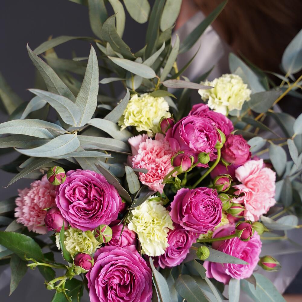Гвоздики, Кустовые розы, Пионовидные розы, Розы