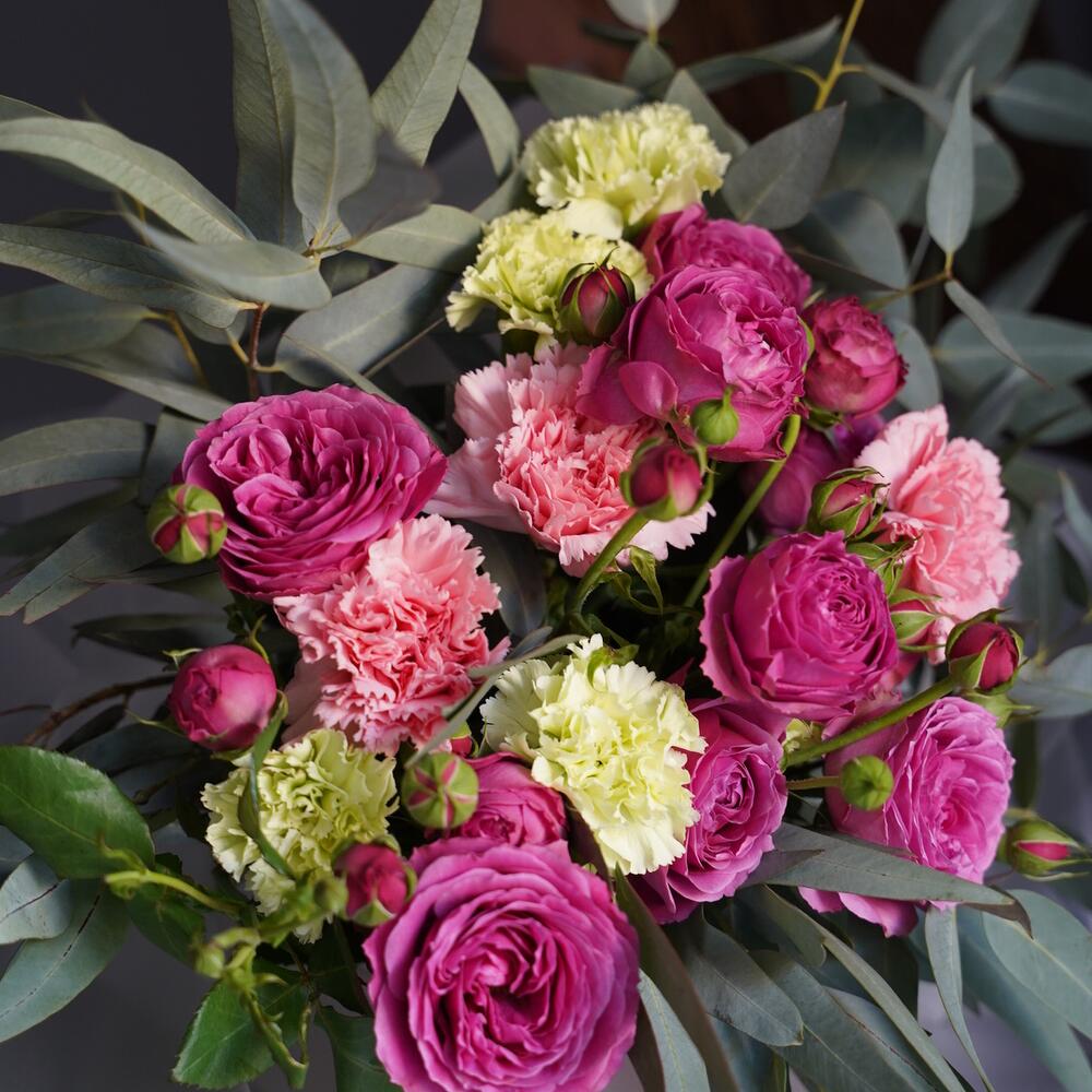 Альстромерии, Гвоздики, Кустовые розы, Лизиантусы, Розы, Хризантемы