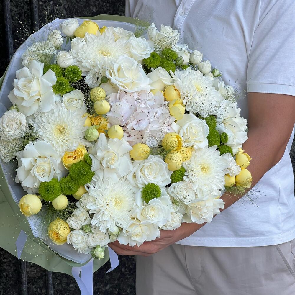Гортензия – 1 шт. Роза – 13 шт. Спрей роза – 11 шт. Хризантема – 10 шт. Рускус – 5 шт. бумага дизайнерская – 1 шт.