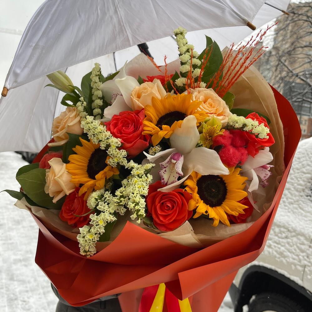Альстромерия – 1 шт.Орхидея Цимбидиум – 3 шт.Статица – 3 шт.Роза Россия – 9 шт.Подсолнух – 3 шт.Пленка матовая – 6 шт.Салал пучок – 1 шт.сухоцвета – 10 шт.