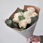 Эвкалипт – 2 шт.Лента атласная – 1 шт.Упаковка дизайнерская – 2 шт.Роза Эквадор 60 см – 7 шт.