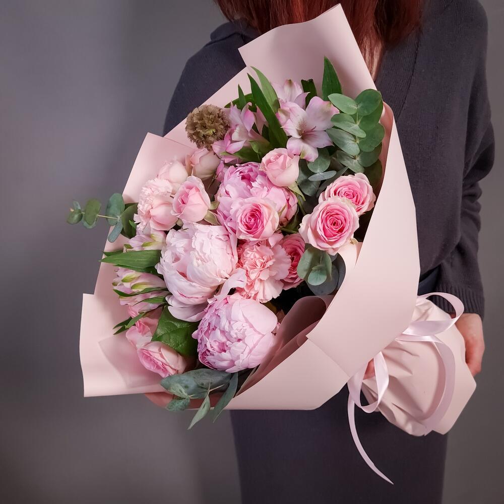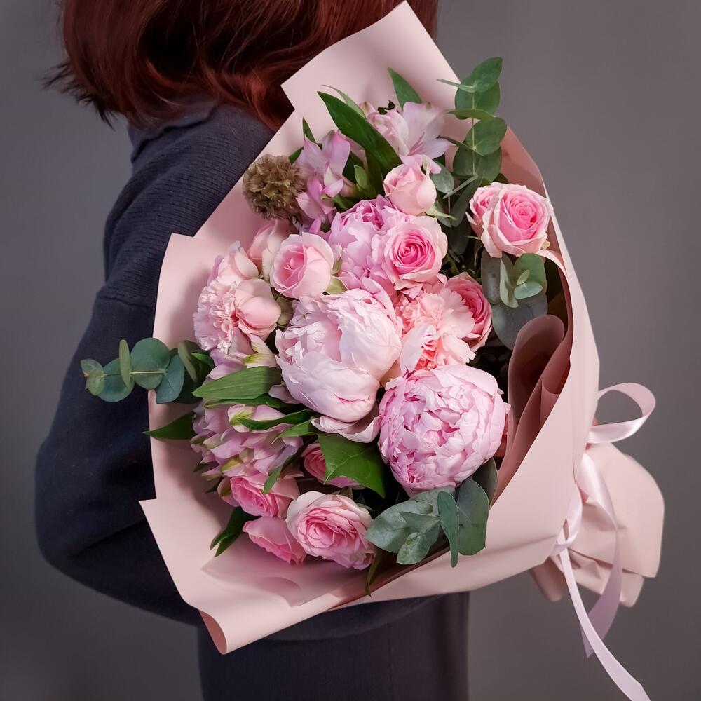 Альстромерия – 2 шт.Эвкалипт – 2 шт.Пион Сара Бернар – 3 шт.Упаковка дизайнерская – 1 шт.Аквапак – 1 шт.Диантус розовый – 2 шт.Средство для продления жизни цветов – 2 шт.Скабиоза стелата – 1 шт.роза кустовая динара – 3 шт.