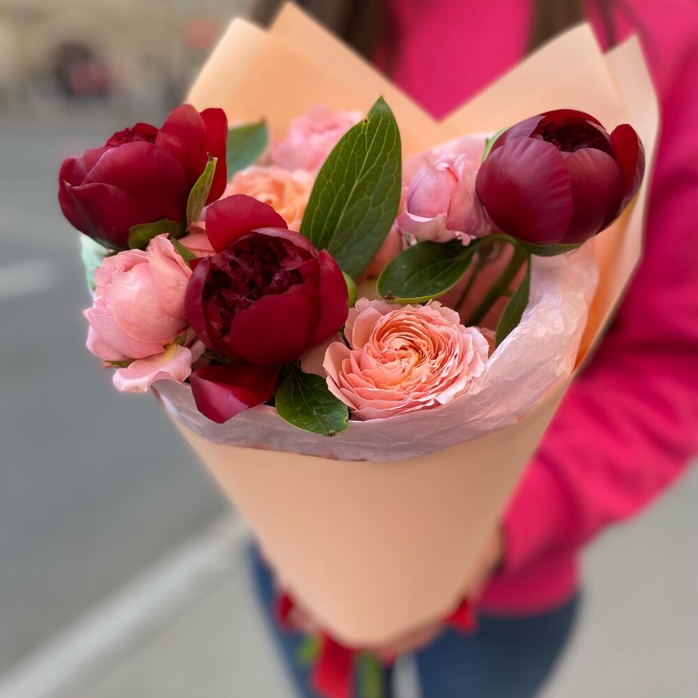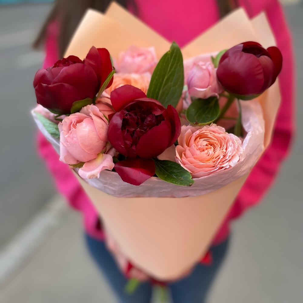 Бордовые пионы с персиковой пионовидной розой