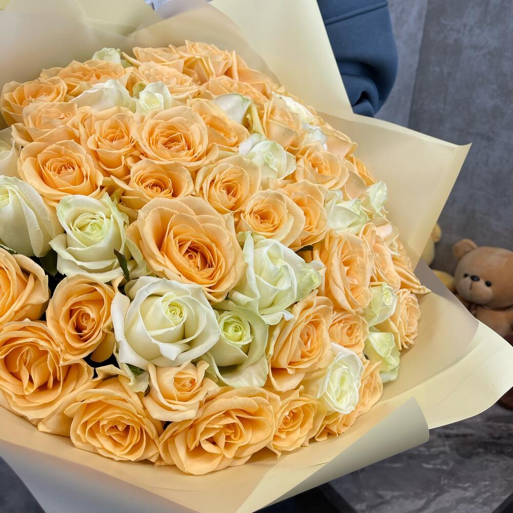 Букет 51 шт. из элитных белых и персиковых роз