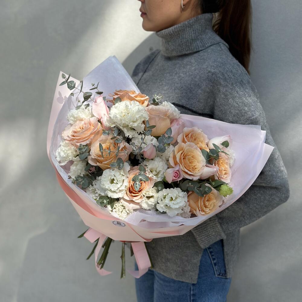 Альстромерии, Кустовые розы, Лизиантусы, Пионовидные розы, Розы, Ромашки