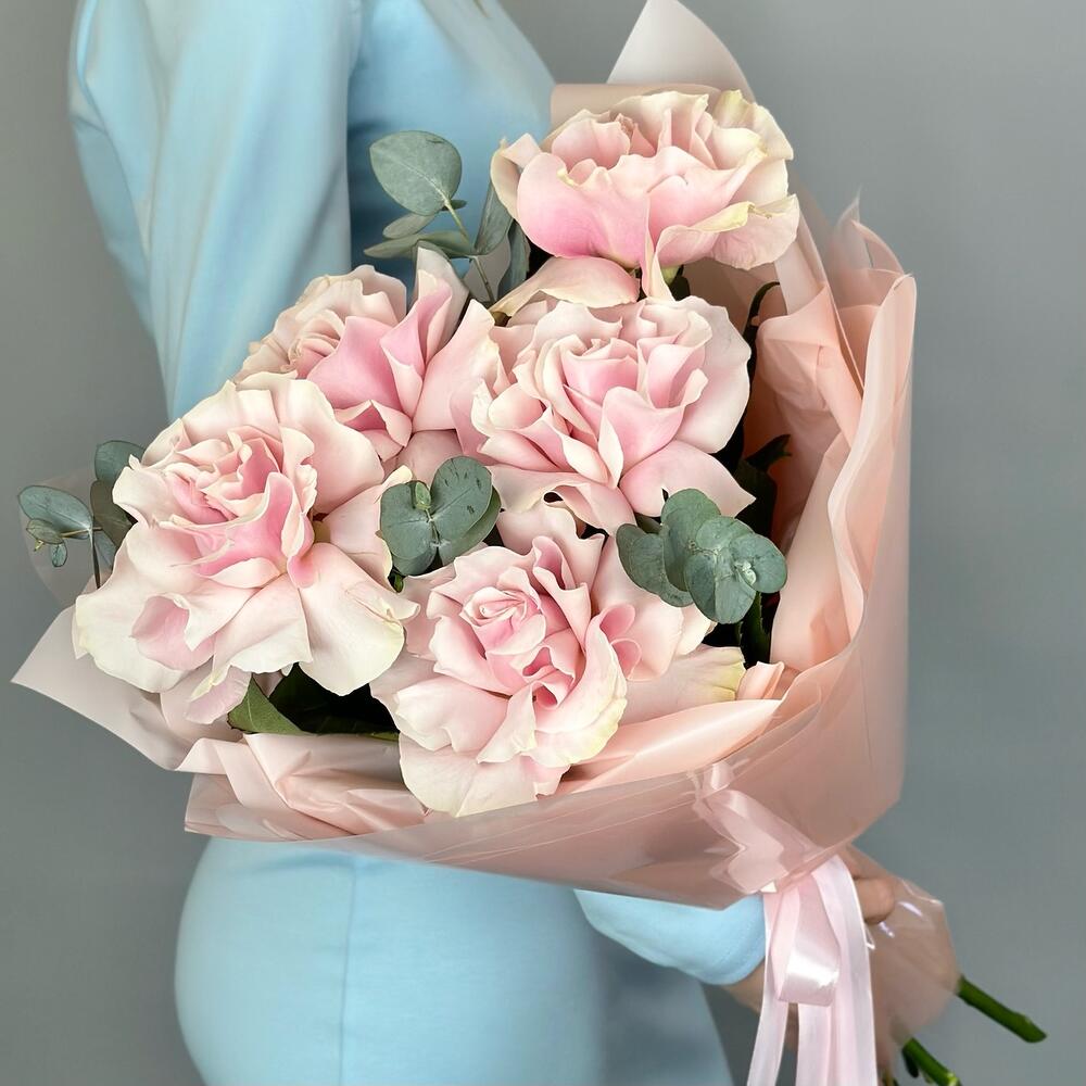 Лента атласная – 1 шт.Французская роза – 5 шт.Дизайнерская упаковка – 1 шт.эвкалипт цинерея пучок – 1 шт.влагостойкий тишью – 1 шт.