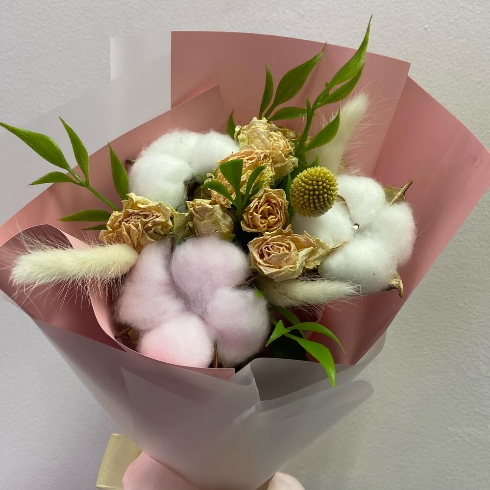 Хлопок – 3 шт.Роза кустовая – 1 шт.Лагурус – 3 шт.Авторская упаковка – 1 шт.Открыточка с вашими пожеланиями – 1 шт.