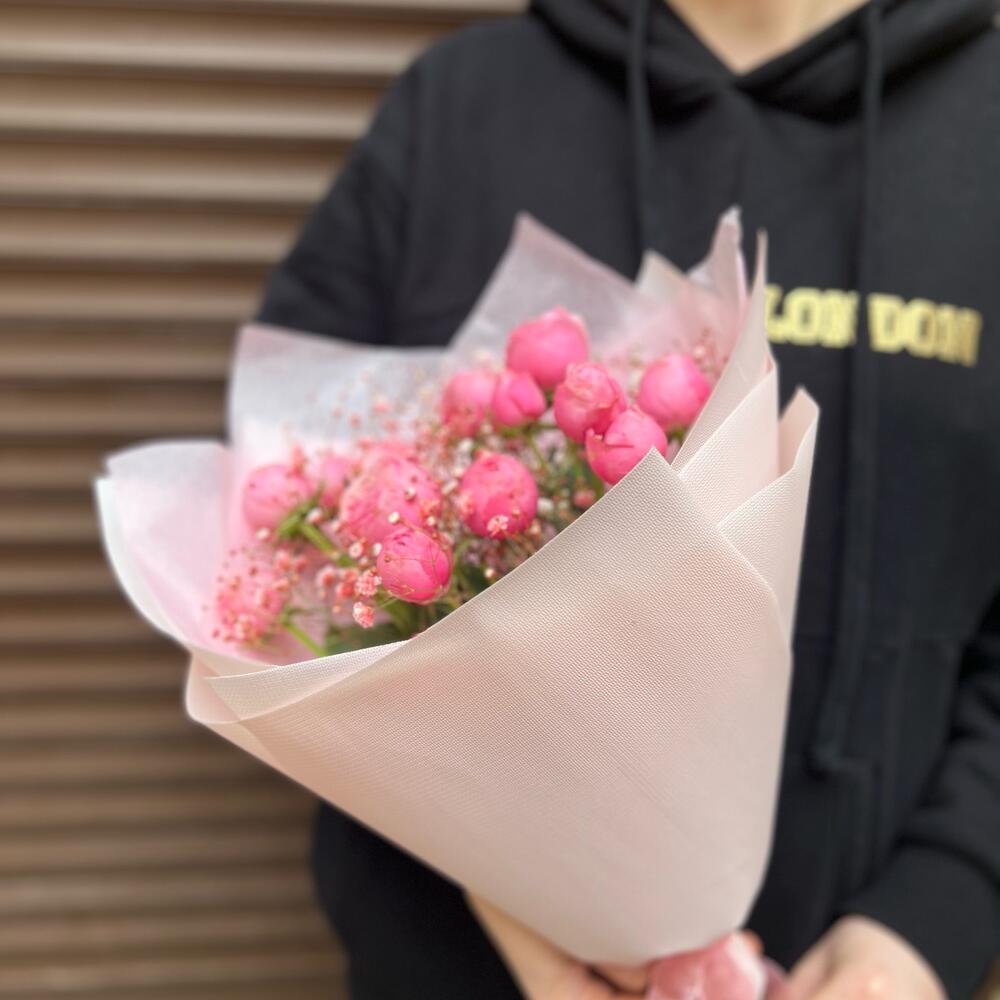 Букет из пион розы и гипсофилы