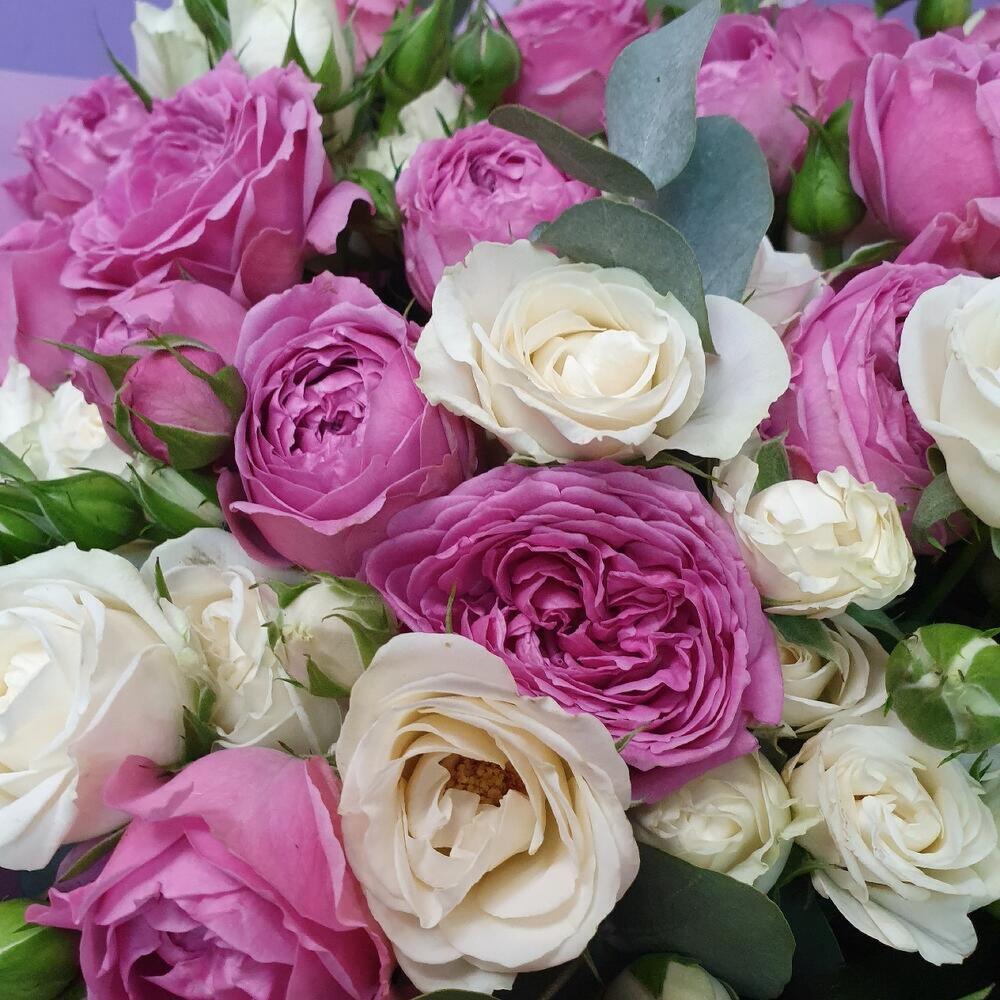 Роза пионовидная кустовая – 11 шт. Роза кустовая белая – 19 шт. Эвкалипт – 5 шт. Упаковка дизайнерская – 3 шт. Открыточка с вашими пожеланиями – 1 шт.