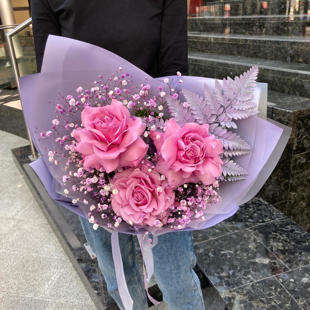 Гипсофила – 3 шт.Лента – 2 шт.Папоротник – 1 шт.Роза – 3 шт.Упаковка дизайнерская – 2 шт.