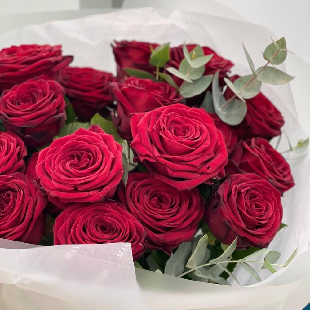 Букет из высоких красных роз с эвкалиптом